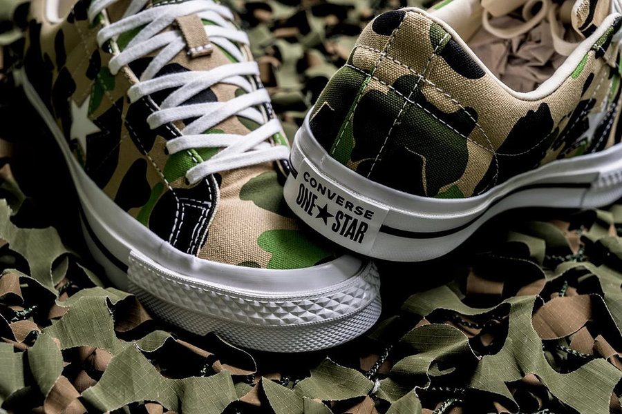 这双鞋以经典的 One Star 鞋款为蓝本设计,整体鞋面采用迷彩图案设计,以浅棕色为主,点缀浅绿色与深绿色的拼接色调,军事迷彩风发挥得淋漓尽致。