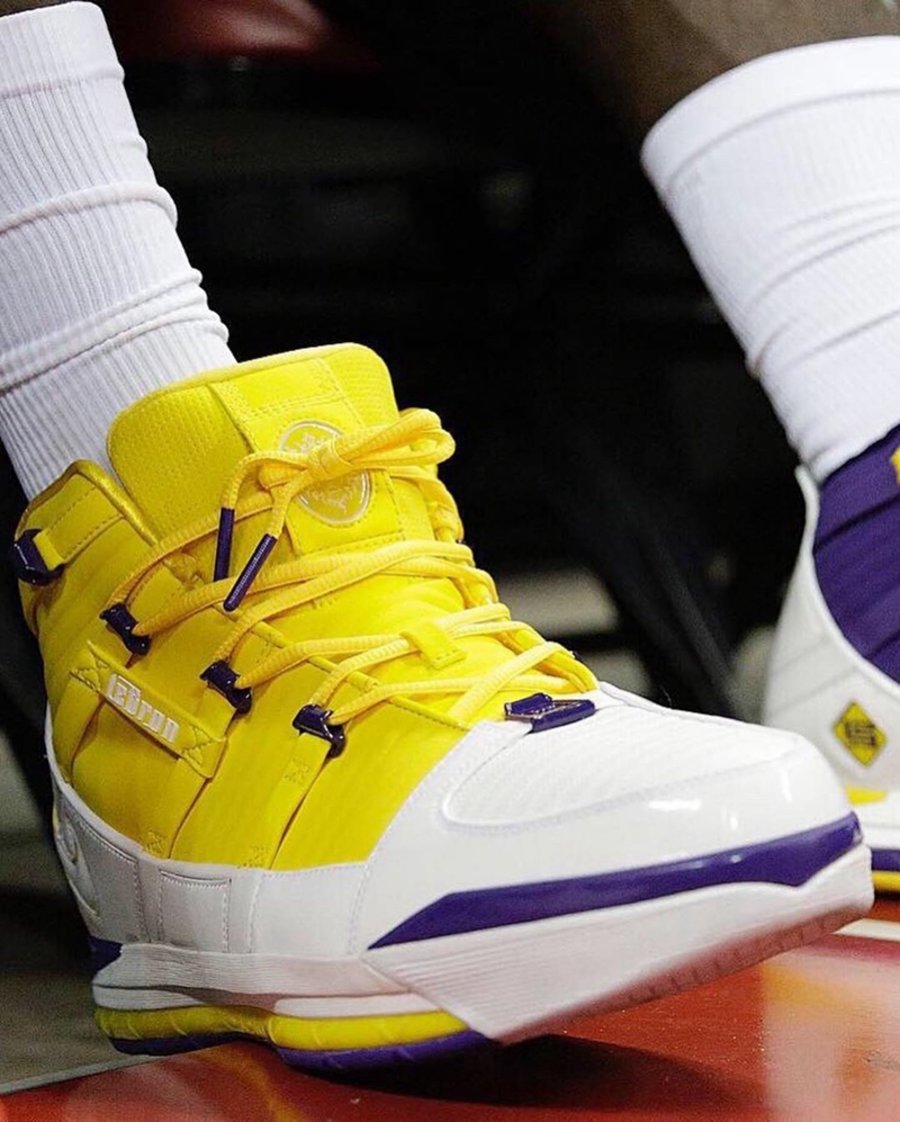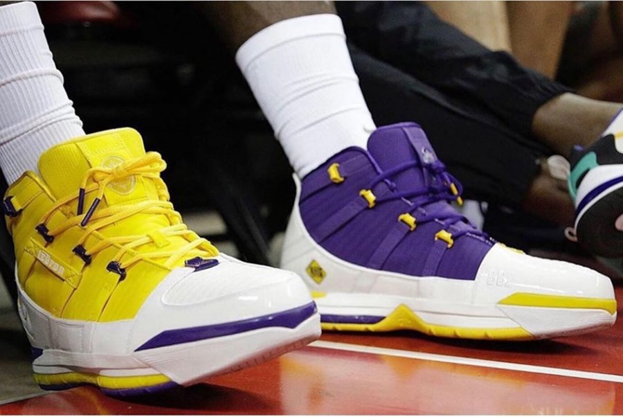 今日勒布朗现身球馆,上脚一双从未曝光的湖人鸳鸯配色 Zoom LeBron 3 PE,白色鞋身分别以紫、黄点缀,外底、鞋头、鞋带,甚至外露的 Zoom 气垫等多处细节,也均采用不对称的鸳鸯设计,精致之余,更彰显霸气醒目的视觉冲击!