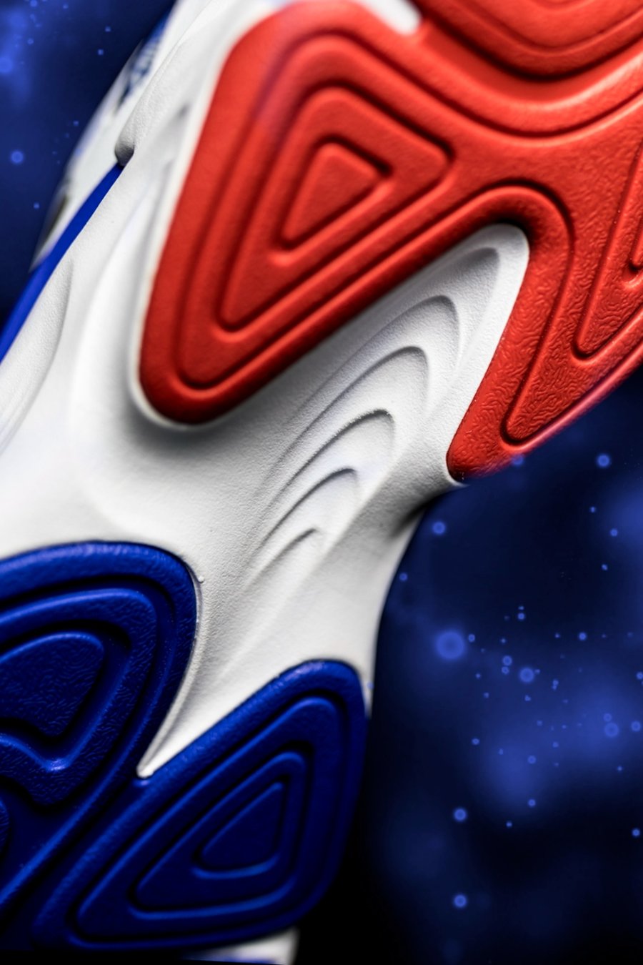 白色鞋面搭配金属质感的蓝色中底,并以红黄两色点缀。