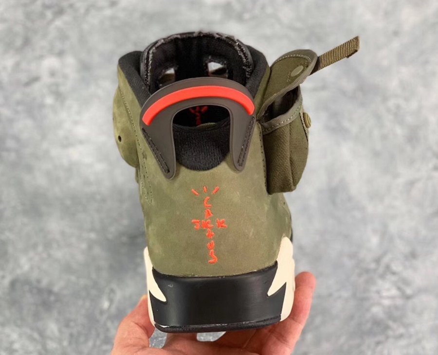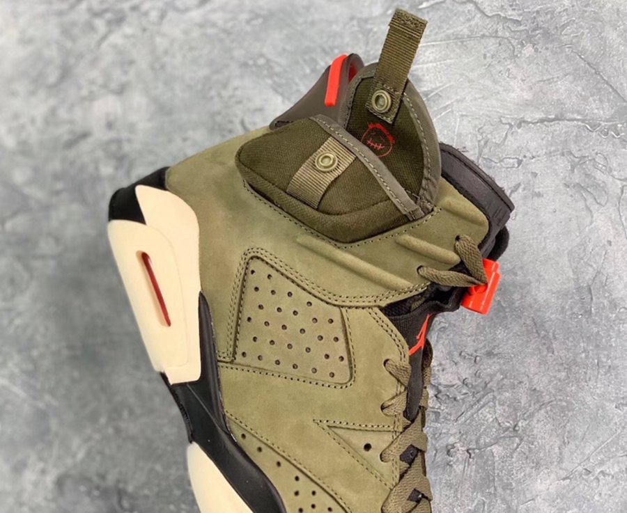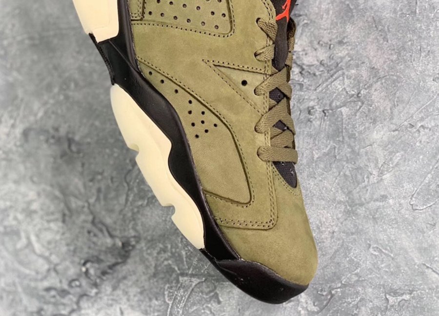 麂皮鞋面采用 Travis Scott 最爱的橄榄绿色覆盖,并在细节处辅以醒目的橙色点缀,带来浓郁军事风造型。尽管造型上延续 Air Jordan 6 的标志性的鞋舌,却将内衬材质,改成了做旧帆布示人,看上去更加硬朗。
