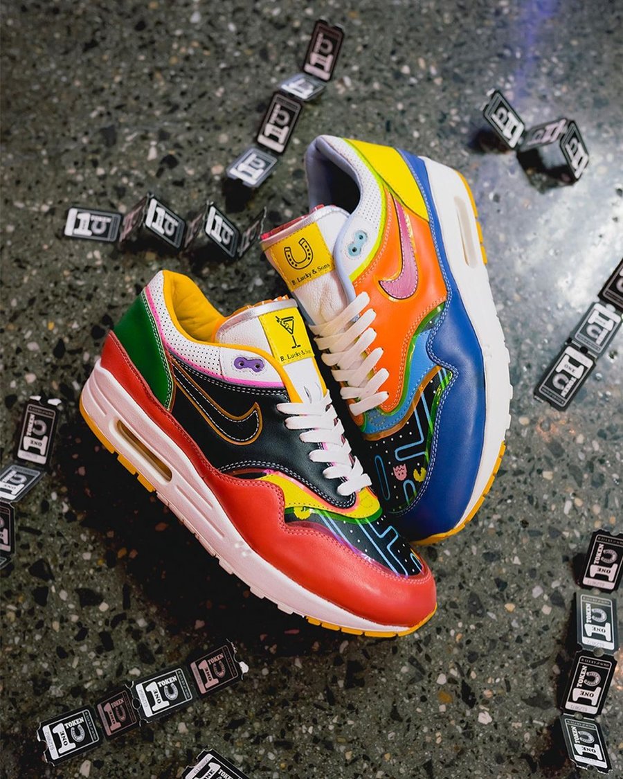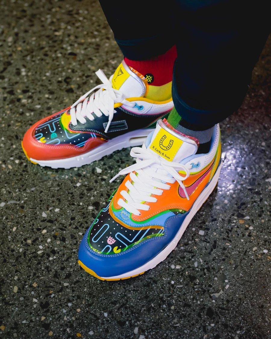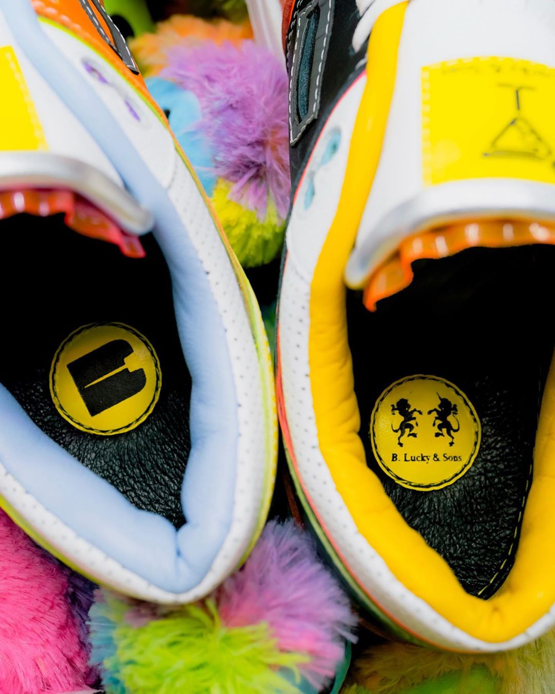 近日,知名球鞋定制团队 BespokeIND 再度打造了一款特殊的鞋款。 ▼ B. Lucky & Sons 这双鞋以 B. Lucky & Sons 店铺装修主题为灵感,在鞋面上以多彩撞色和游戏画面作为装饰。 左右双脚为鸳鸯组合,呈现出独特的糖果色系,别具玩味。 这双定制鞋款不会市售,感兴趣的小伙伴可以点击 BespokeIND 官网,了解更多产品详情。 Pic via:lucasblackman / bluckyandsons / bespoke_ind