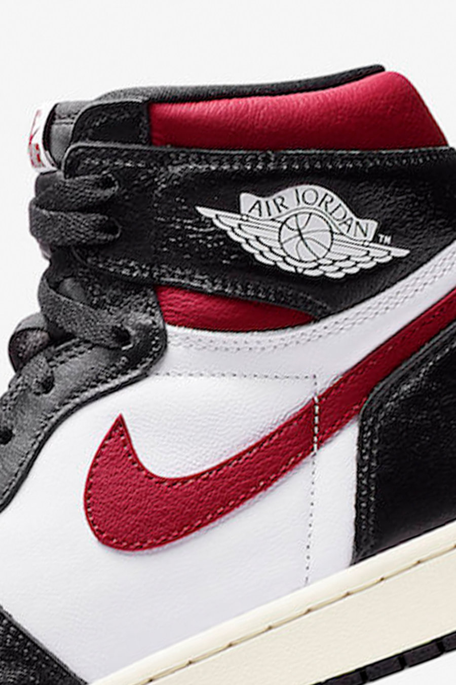 鞋面中后部的 Swoosh 以及绑带补强的鞋帮设计,都是 Air Jordan 1 的代表元素。