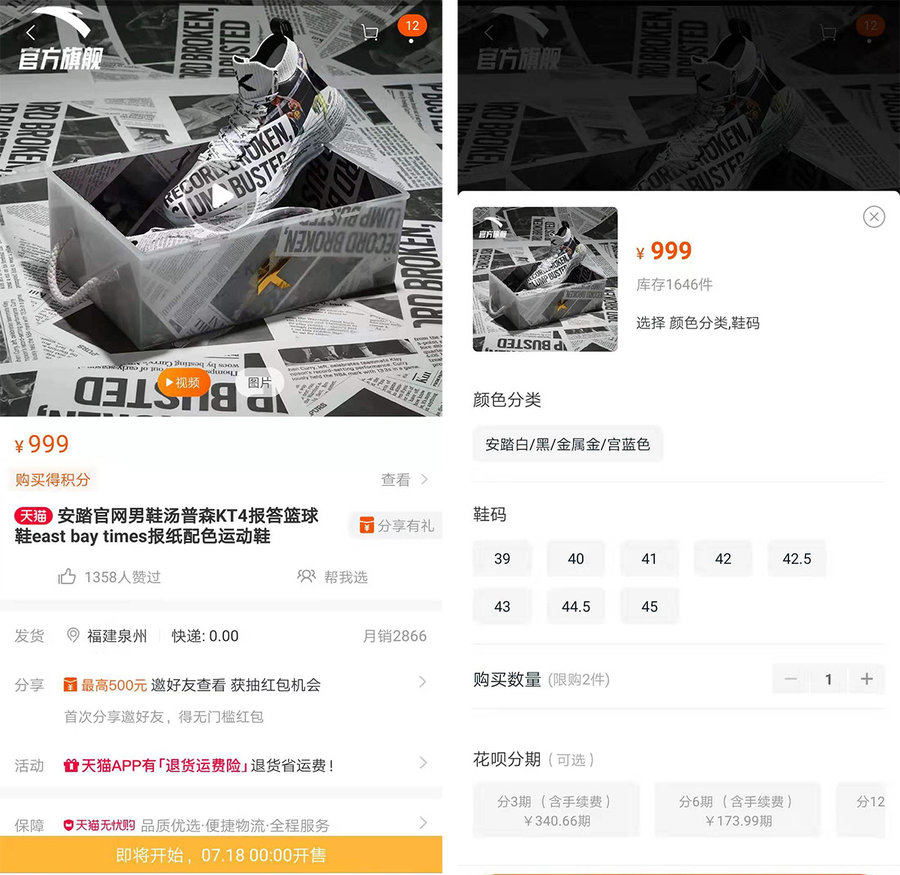 今天早上正式登陆安踏天猫旗舰店,发售价为 ¥999 RMB,不过很快就售罄,小编也没能顺利入手。