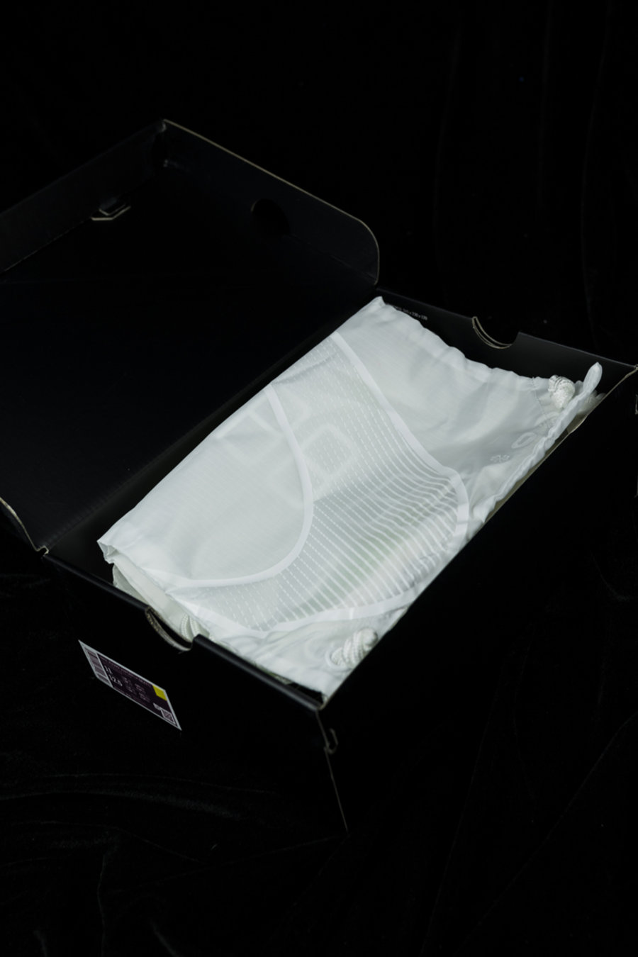 打开鞋盒即可看到透明主题的鞋袋及衬纸。