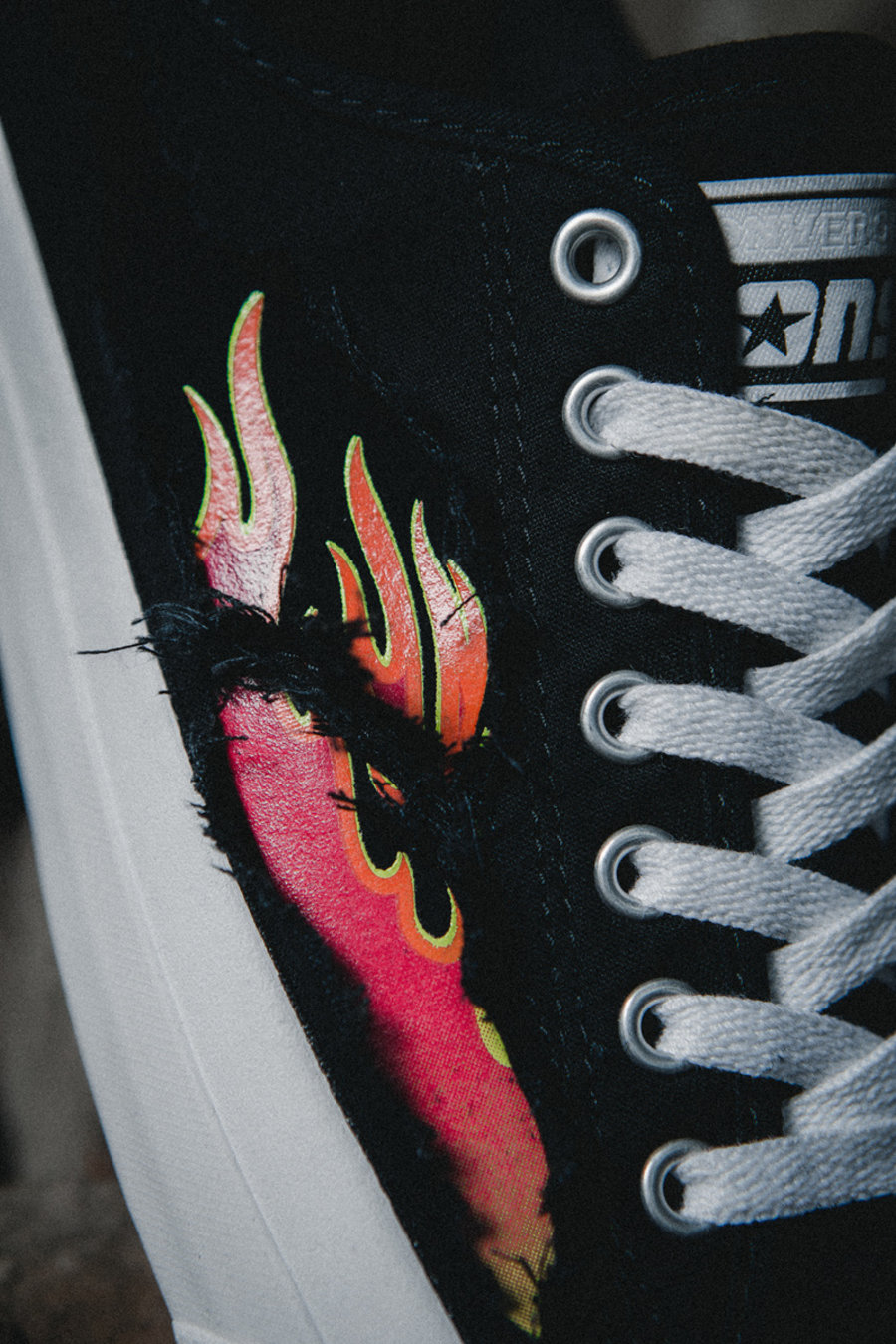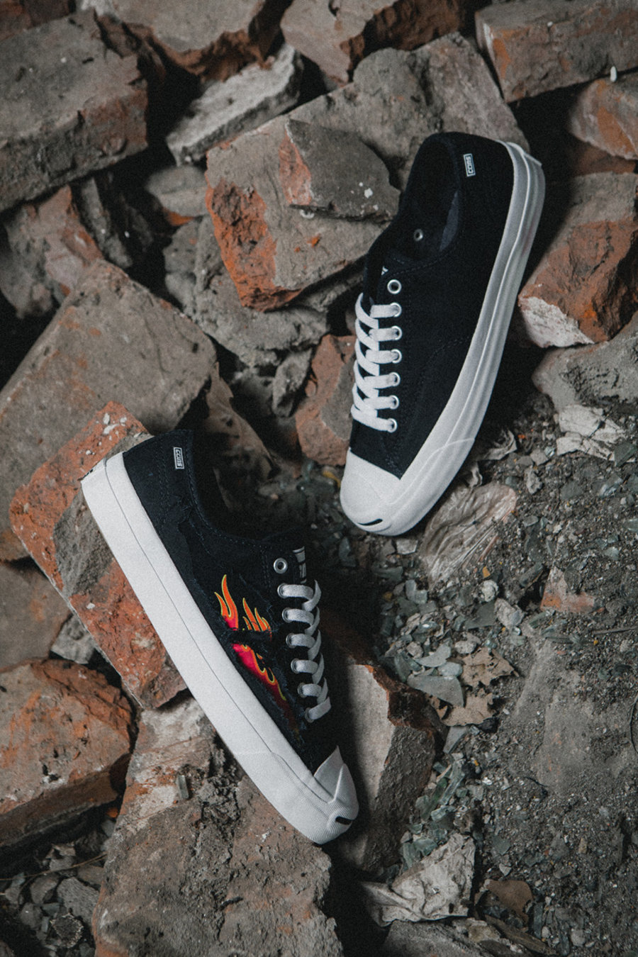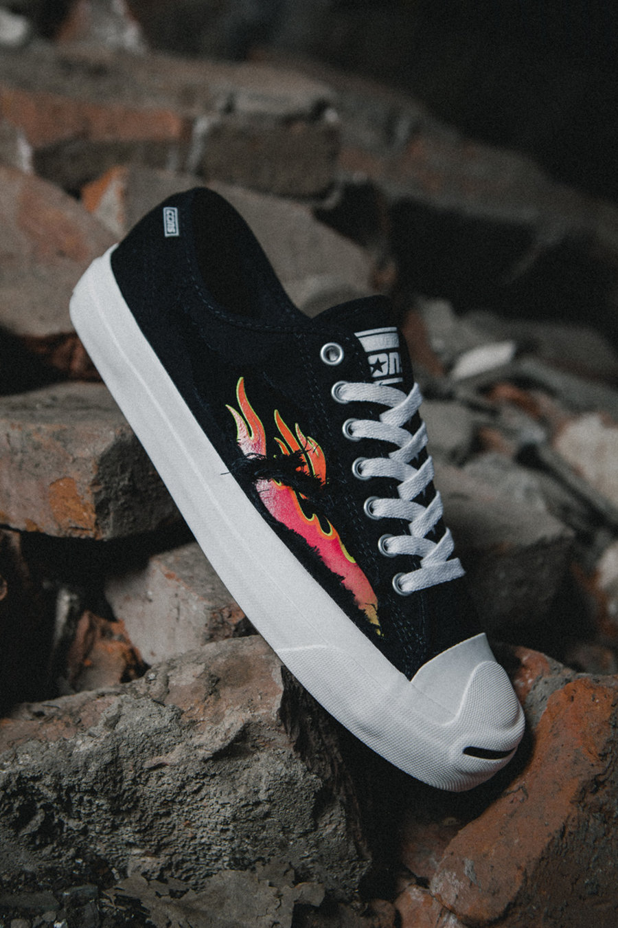 Converse Jack Purcell 则以经典的黑白配色装扮,标志性的 “开口笑” 彰显身份。鞋面撕开后的效果布满火焰印花,最 OG 的街头造型就是你!