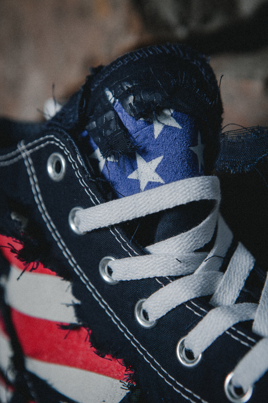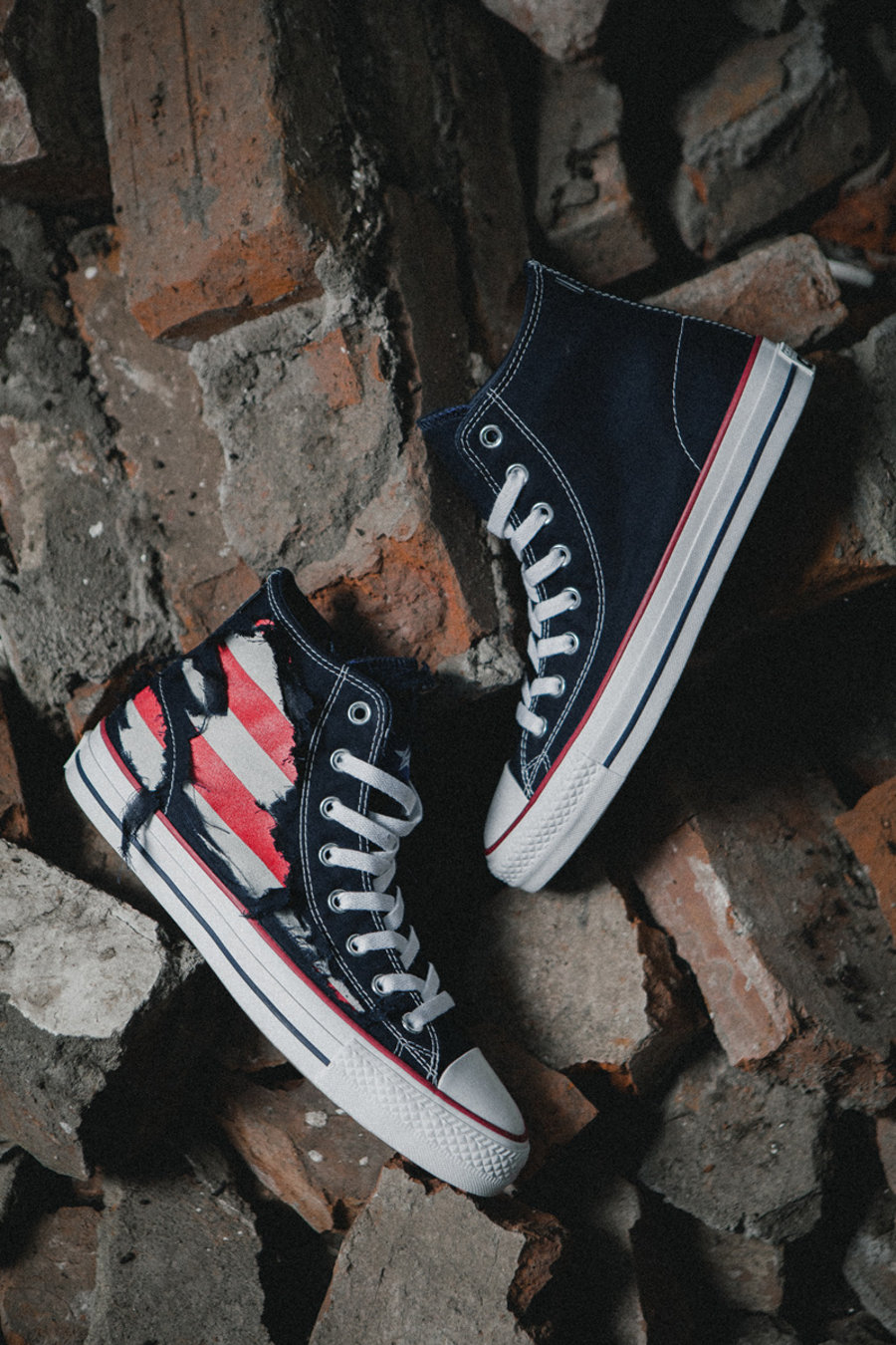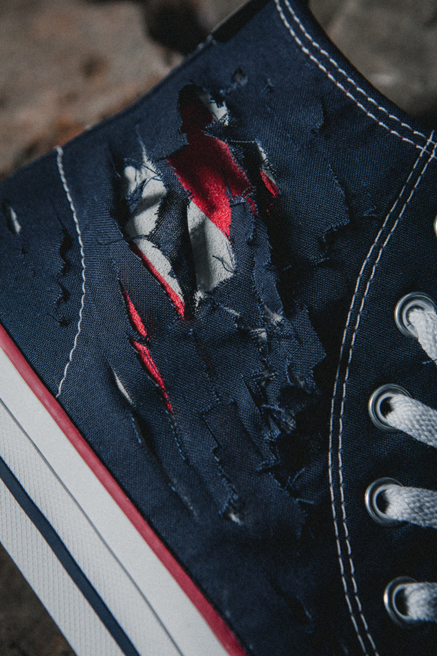 其中 Converse Chuck Taylor Hi 表层采用藏青色装扮,撕开后呈现出美国国旗的图案,经典帆布面料,高帮造型,保留着 Converse 固有的传统风格。