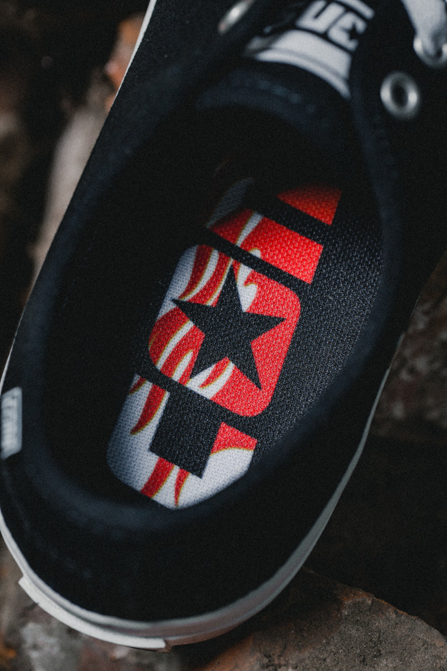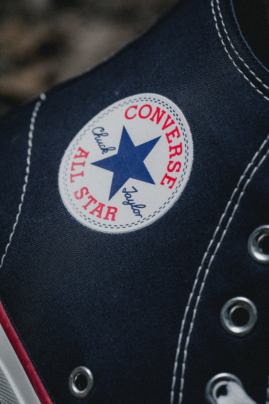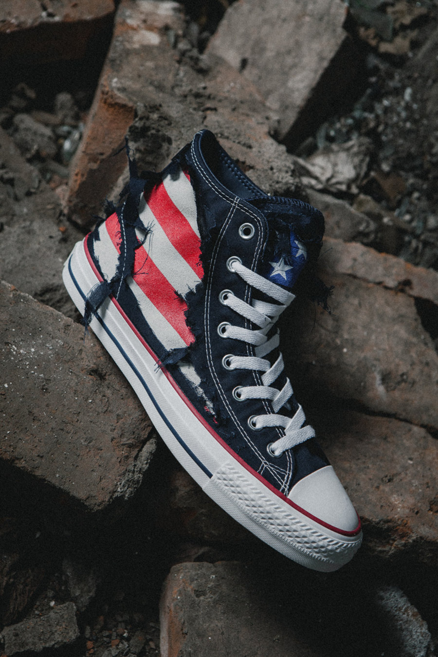 其中 Converse Chuck Taylor Hi 表层采用藏青色装扮,撕开后呈现出美国国旗的图案,经典帆布面料,高帮造型,保留着 Converse 固有的传统风格。