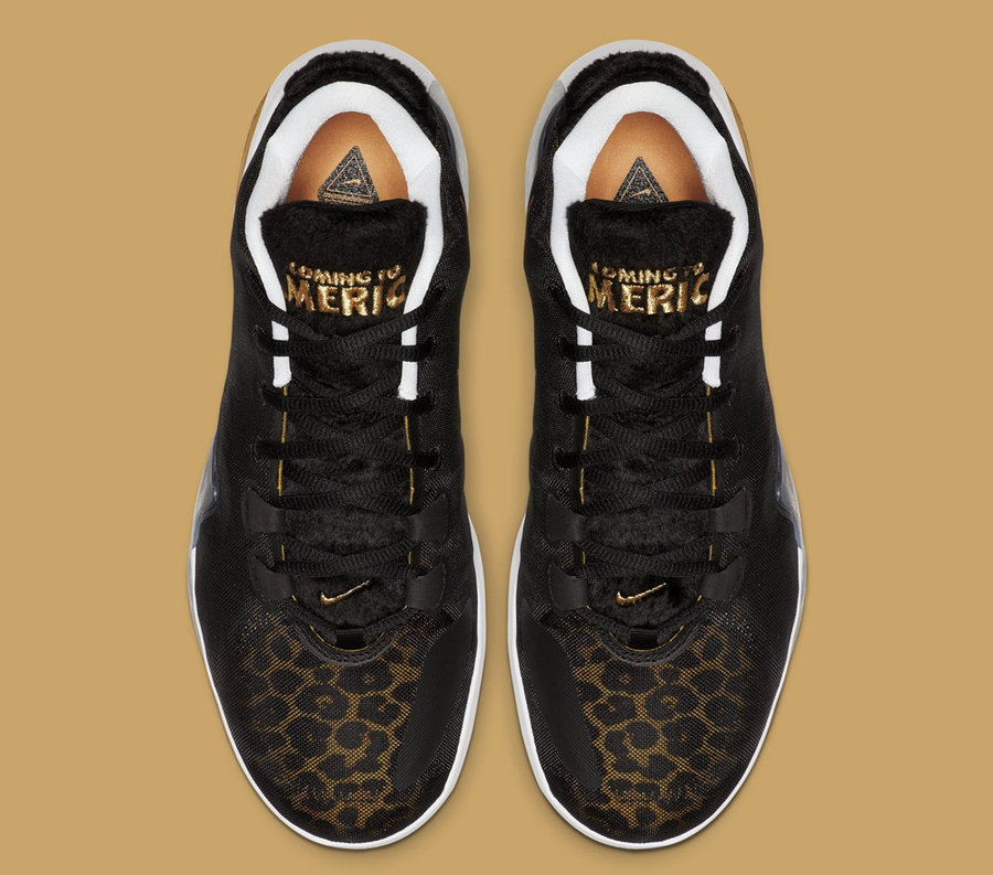 鞋身在黑色的基础上大胆加入黑金豹纹元素。中底标志性的反钩 Swoosh 同样使用华丽的金色纹理点缀,黑色毛绒鞋舌上刺绣有 “Coming to America” 字样,直击主题!