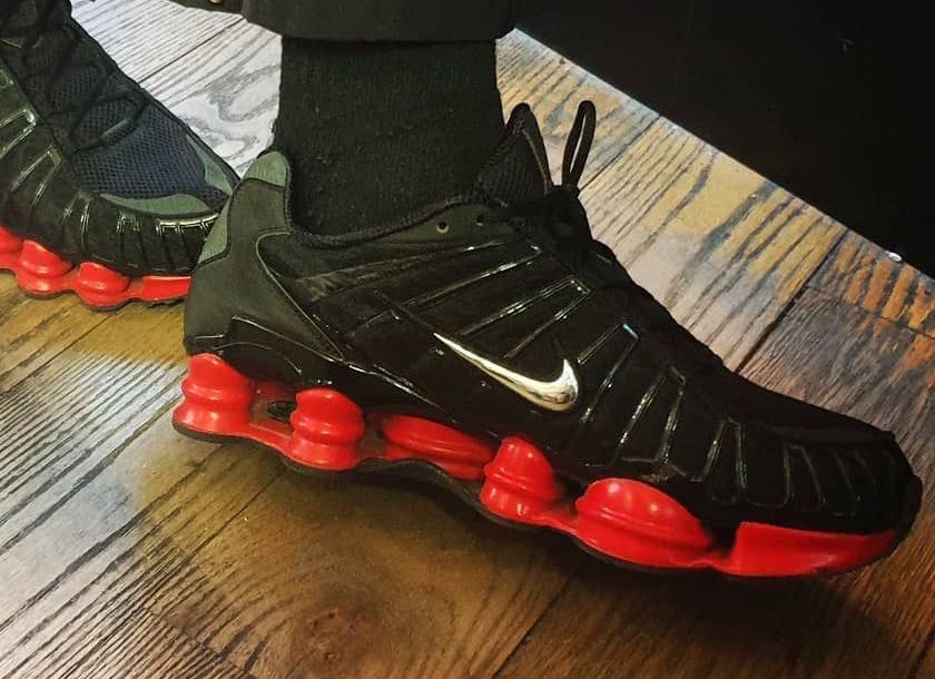 从目前曝出的实物图不难看出,鞋身采用极具气质的黑色透气网布示人,亮眼的大红色 Shox 缓震辅以黑色外底收尾。