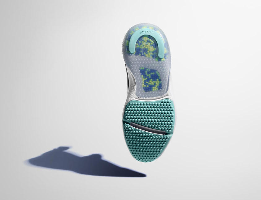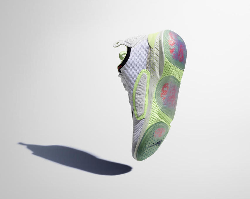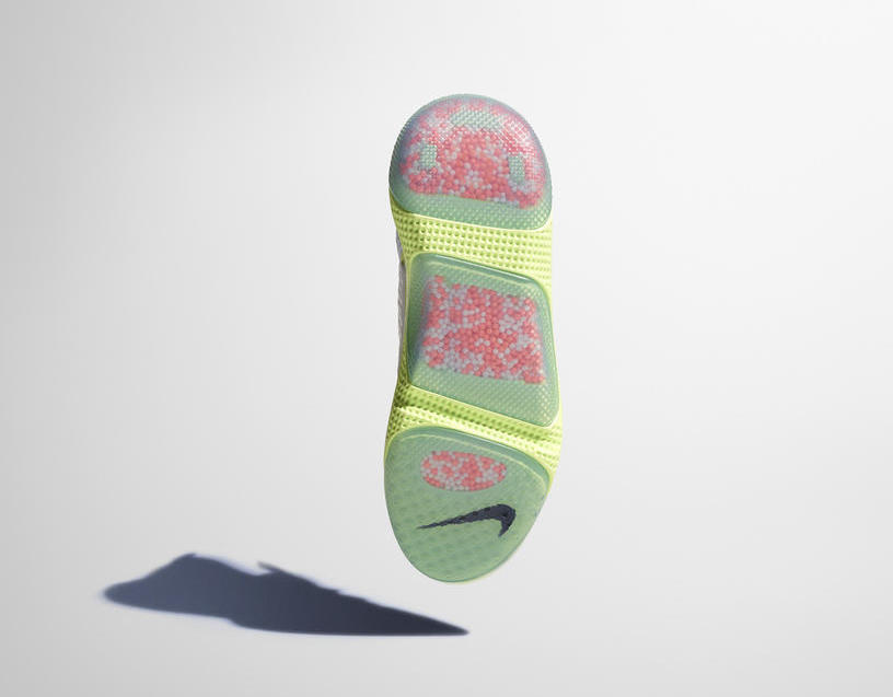 Nike Joyride 的特点在于中底部分放置 TPE 颗粒,每个颗粒的位置都是经过精密研究。TPE 颗粒在鞋底各部分将会分隔出不同区域,脚掌的不同部位会放置不同数量的 TPE 颗粒,这些 TPE 颗粒在接触地面时能够自由的向四面八方延展移动,Nike 称之为 “多重空间位移(multi-dimensional displacement)”。