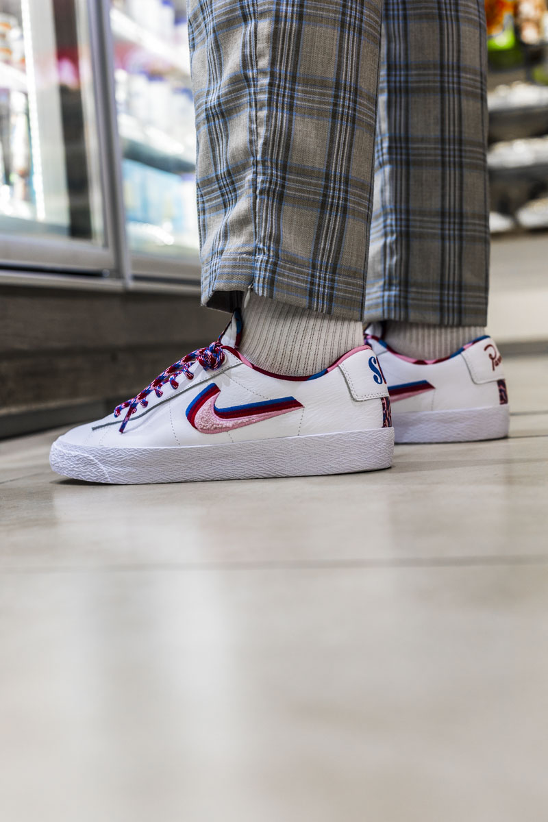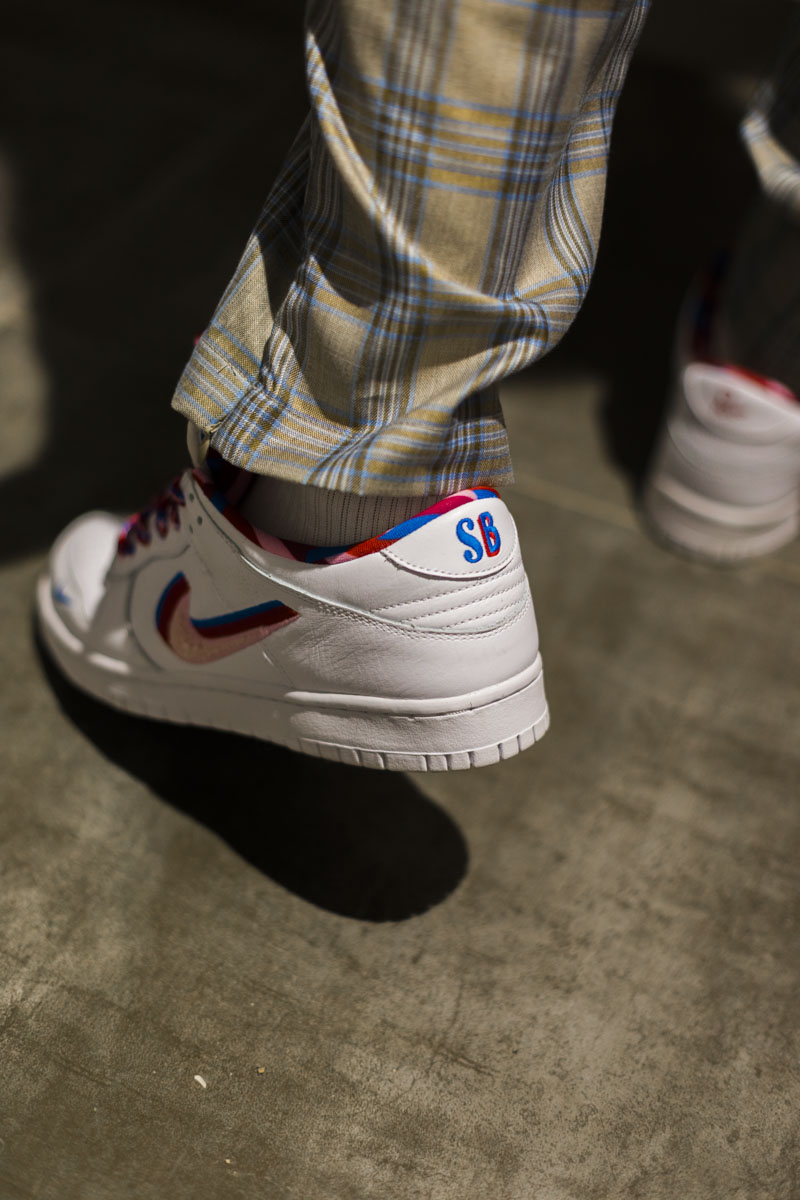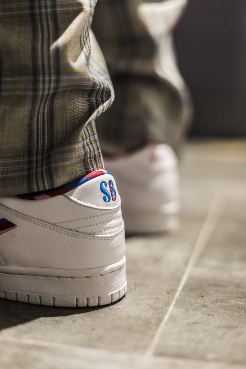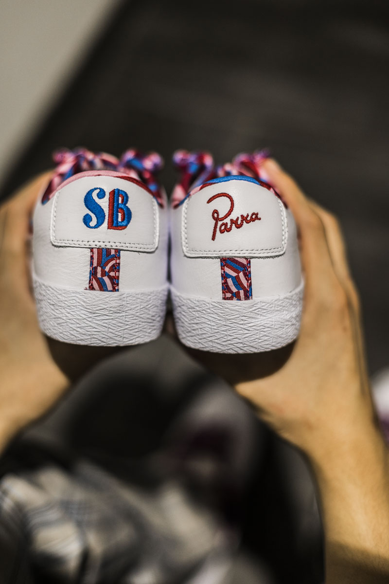 左右两脚的后跟上分别带有 SB 和 Parra Logo,以各自的样式呈现。