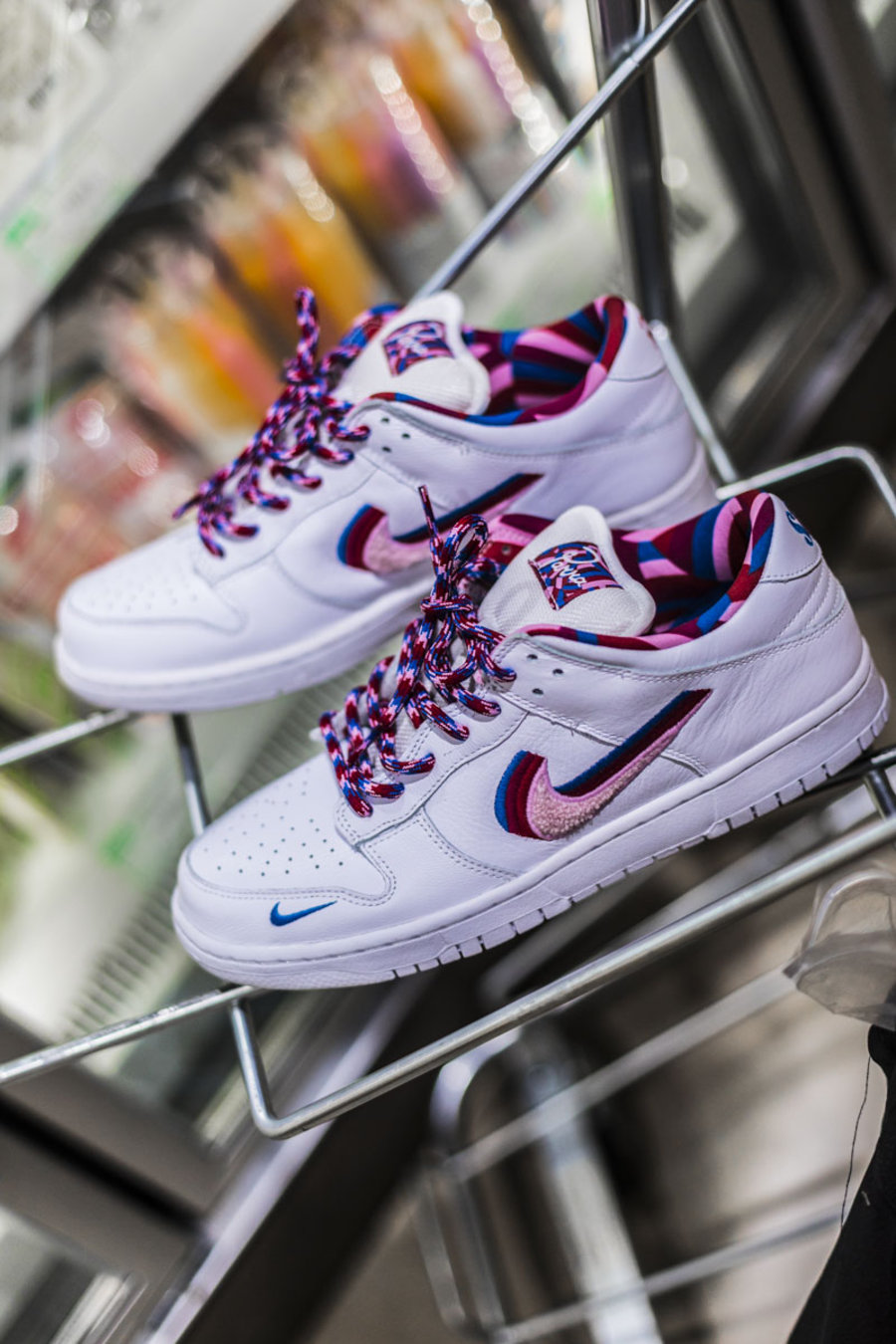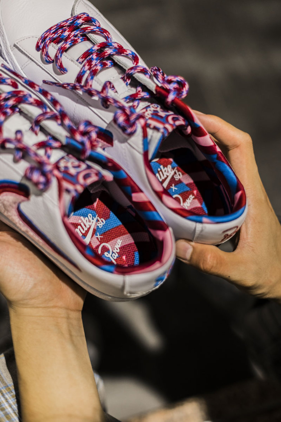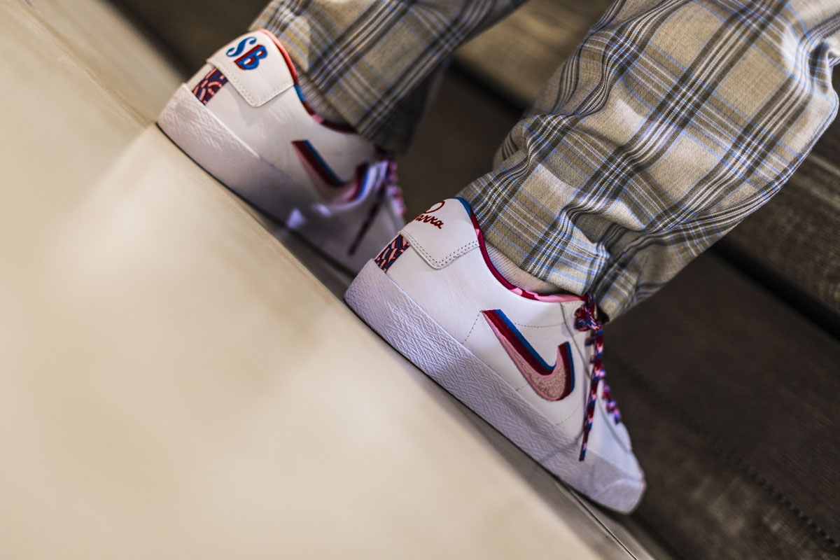 左右两脚的后跟上分别带有 SB 和 Parra Logo,以各自的样式呈现。