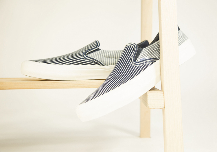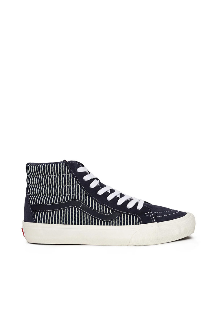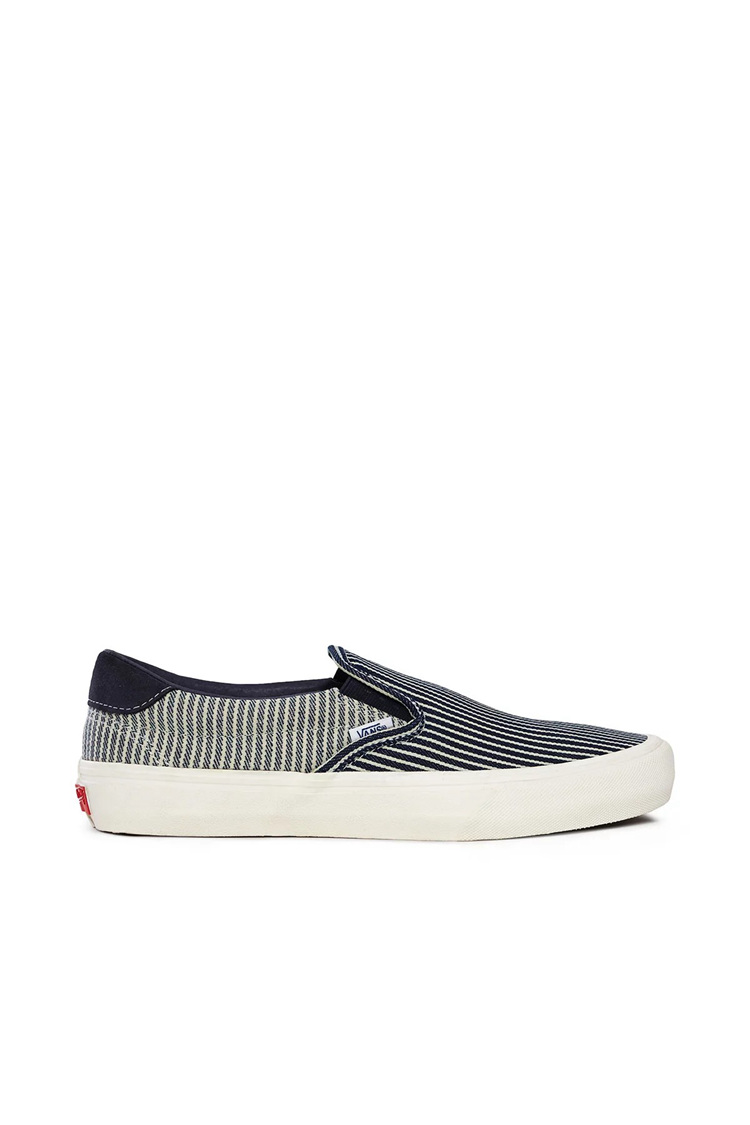 共带来 Sk8-Hi、Era 及 Slip-On 三双经典鞋款,鞋面均以深蓝色条纹纹理装饰。