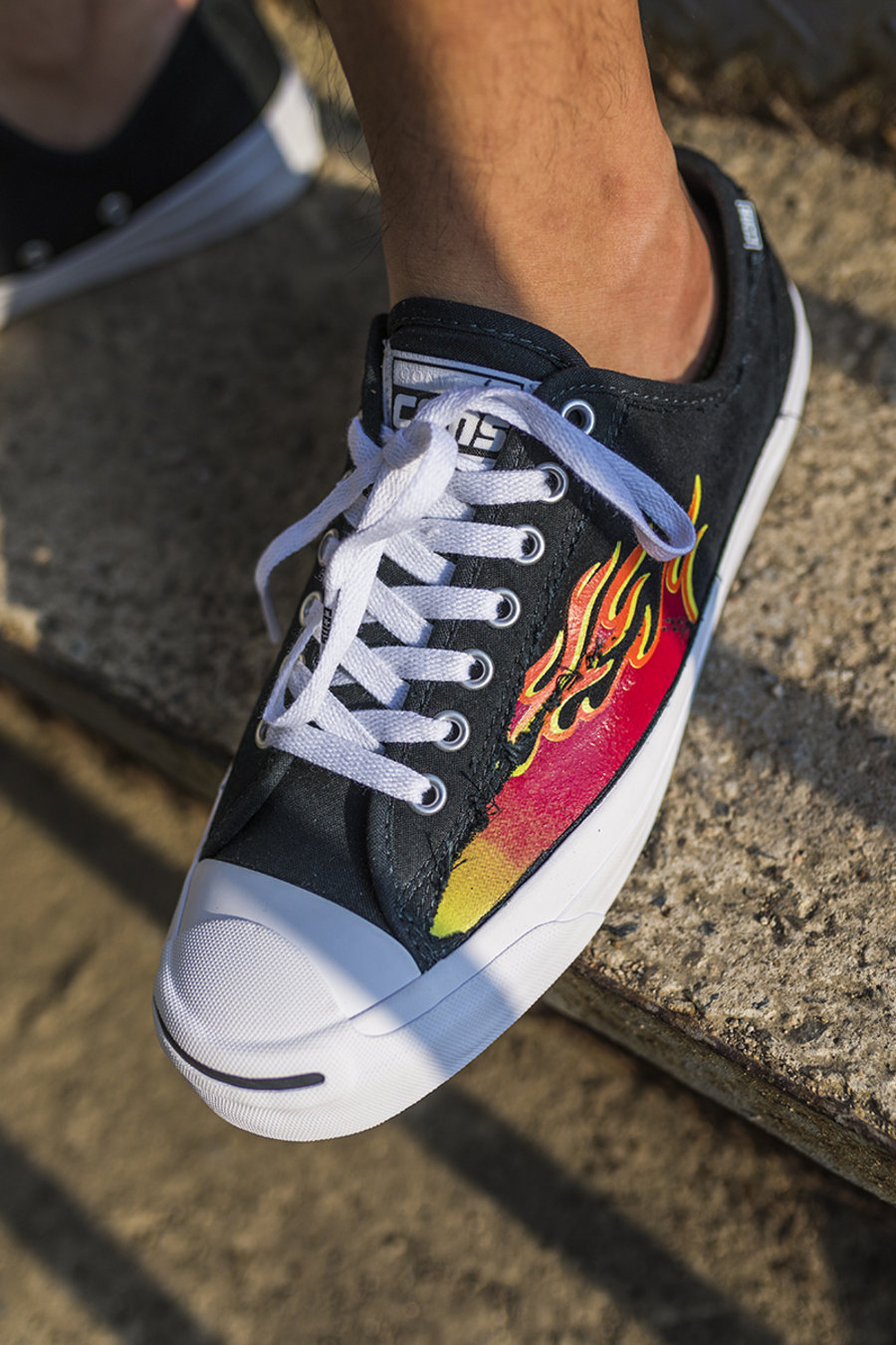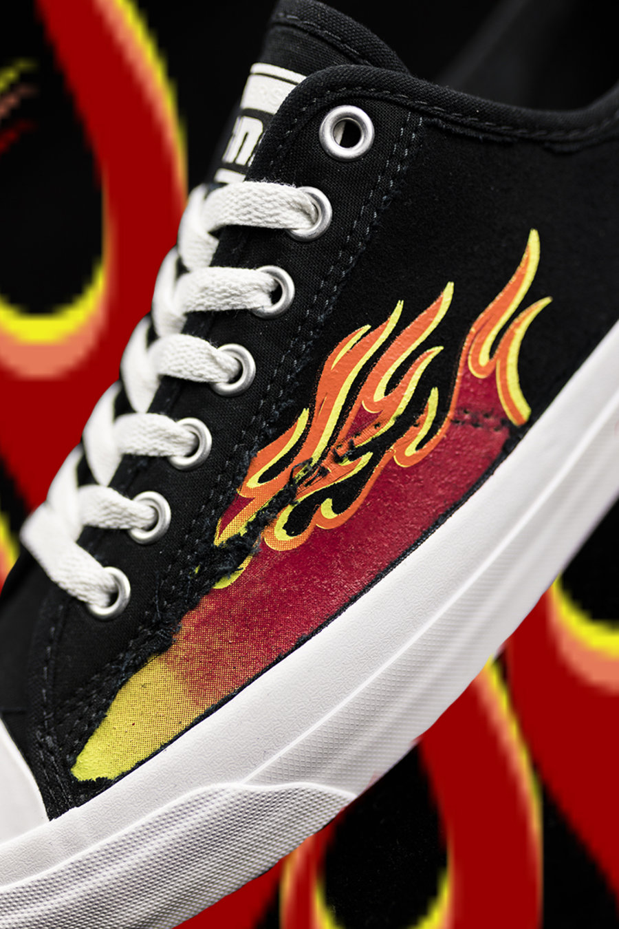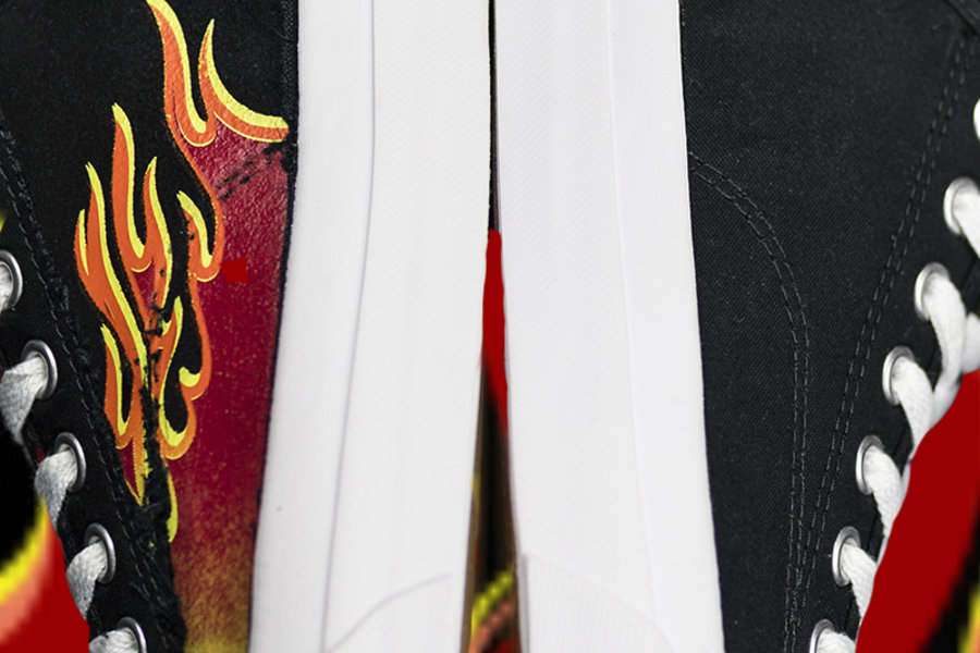 刮开的火焰印花虽然并没有像前两款一样布满鞋面,但从鞋头向后延伸的设计酷似复古肌肉车上的涂装,造型更嚣张。