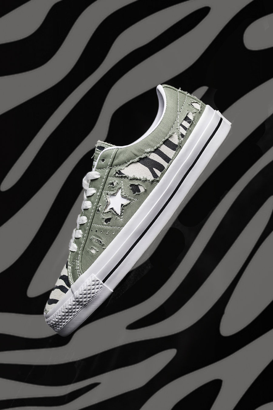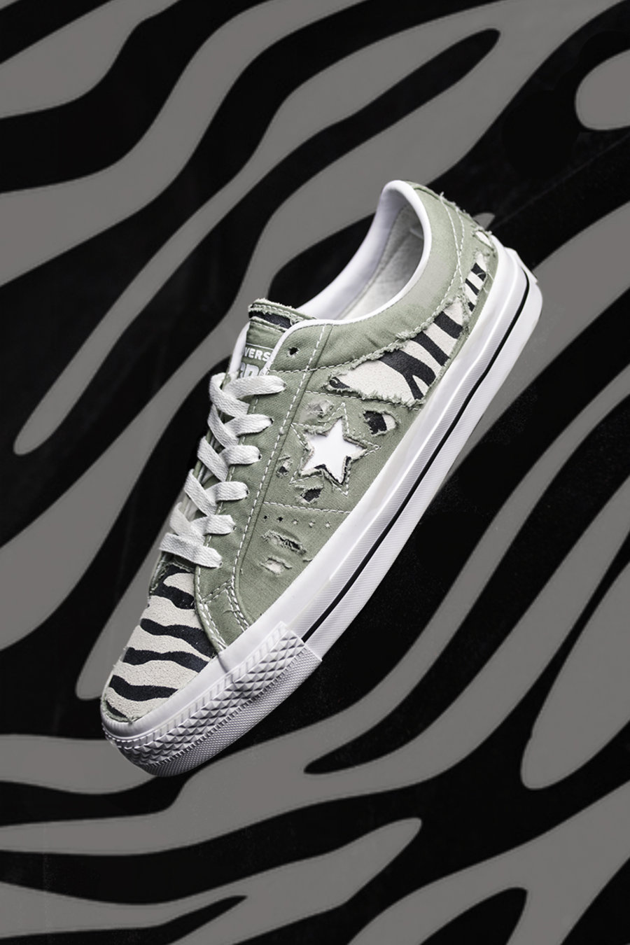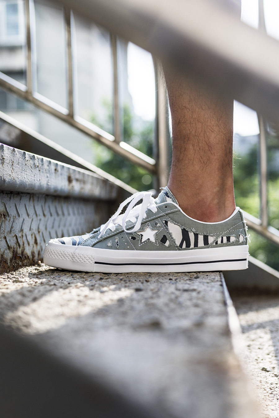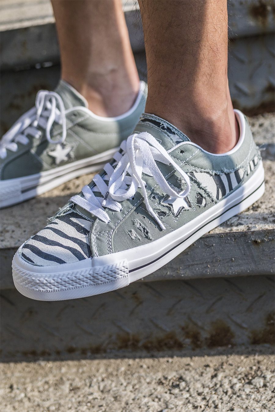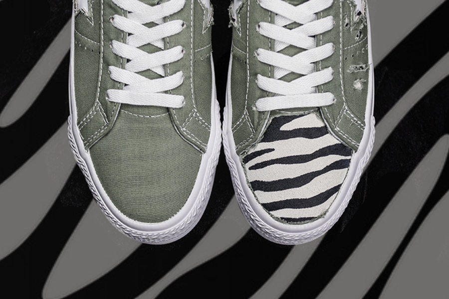由于 One Star 鞋面缝线比较复杂,小编选择分区域割开,并且磨出毛边,搭配斑马纹颇为野性。