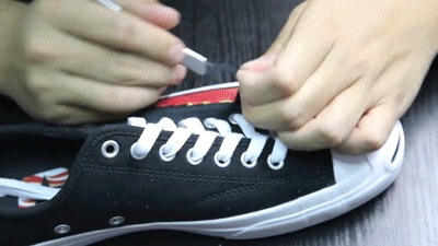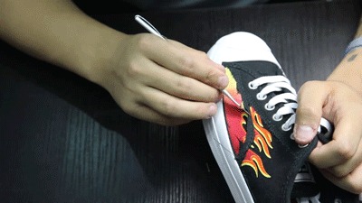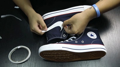 用双面胶将模板粘贴在鞋面适当的位置,然后沿着边缘小心切割即可。