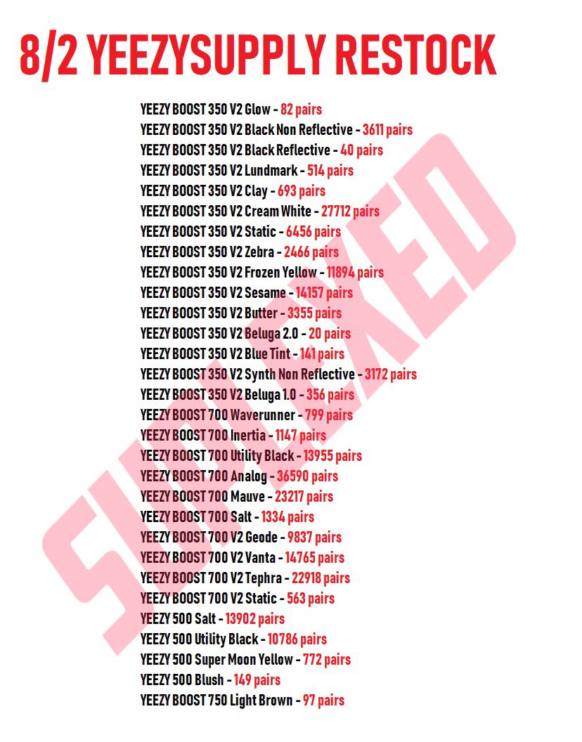 昨晚 Yeezy Boost 350 V2、Yeezy 500、Yeezy Boost 700 及 V2,还有 Yeezy Boost 750 都有多款补货。