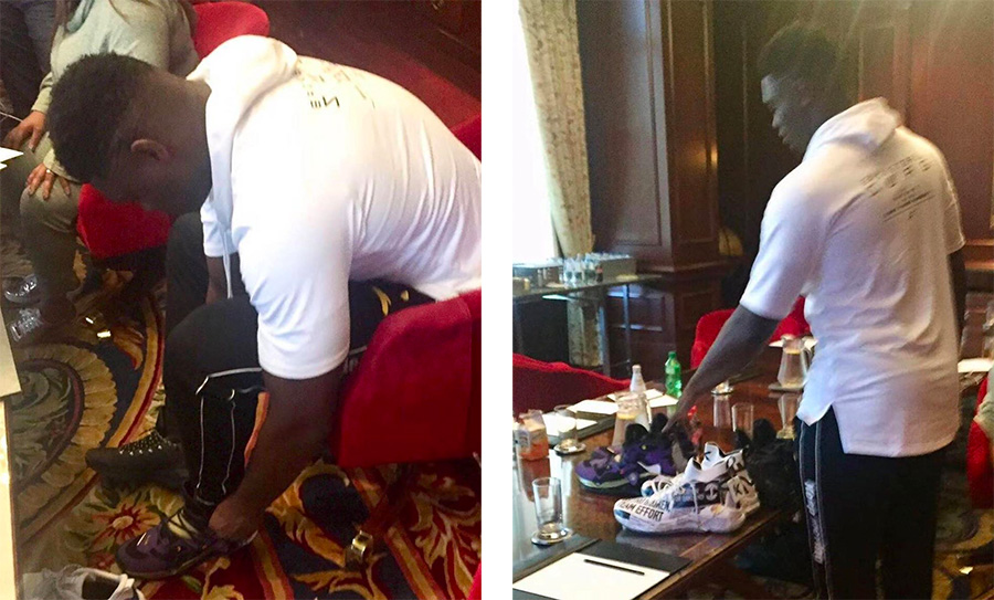 之前网上也传出了安踏团队接触 Zion 的画面,Zion 上脚 KT4 灭霸配色的图片也让人感觉到双方的签约已经很近了。