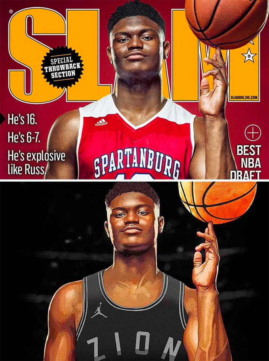 Zion 签约 Jordan Brand 的官宣图片,来源于他 16 岁时登上 SLAM 杂志封面的照片。