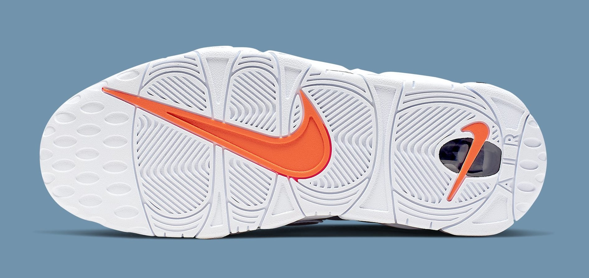 外底前掌、后掌还分别各有一个亮橙色 Swoosh Logo,与白色外底有着高对比的色调反差,非常吸睛