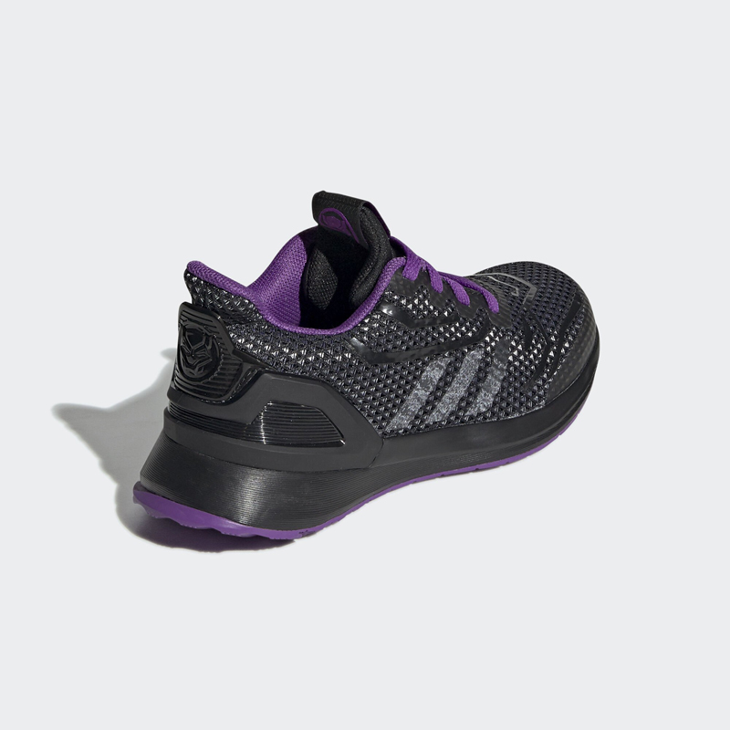 黑豹配色选用了独特的三角纹理网布打造鞋面,并以热熔材质勾勒线条,黑色主调搭配紫色点缀,完美还原黑豹战衣的质感。