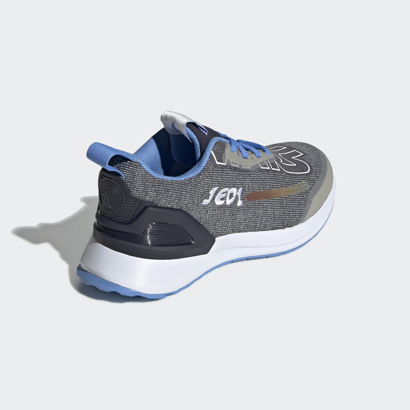 绝地武士配色选用了条纹织物打造鞋面,JEDI 刺绣及光剑般的炫彩线条彰显主题。灰蓝两色搭配素雅又不失科幻。