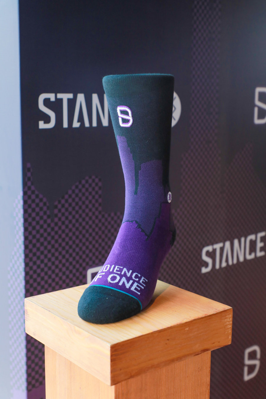 采用丁威迪认为最能表达自我的紫色,并将他的人生信条“Audience of One”融入袜身构图,设计简约精炼而有深意。