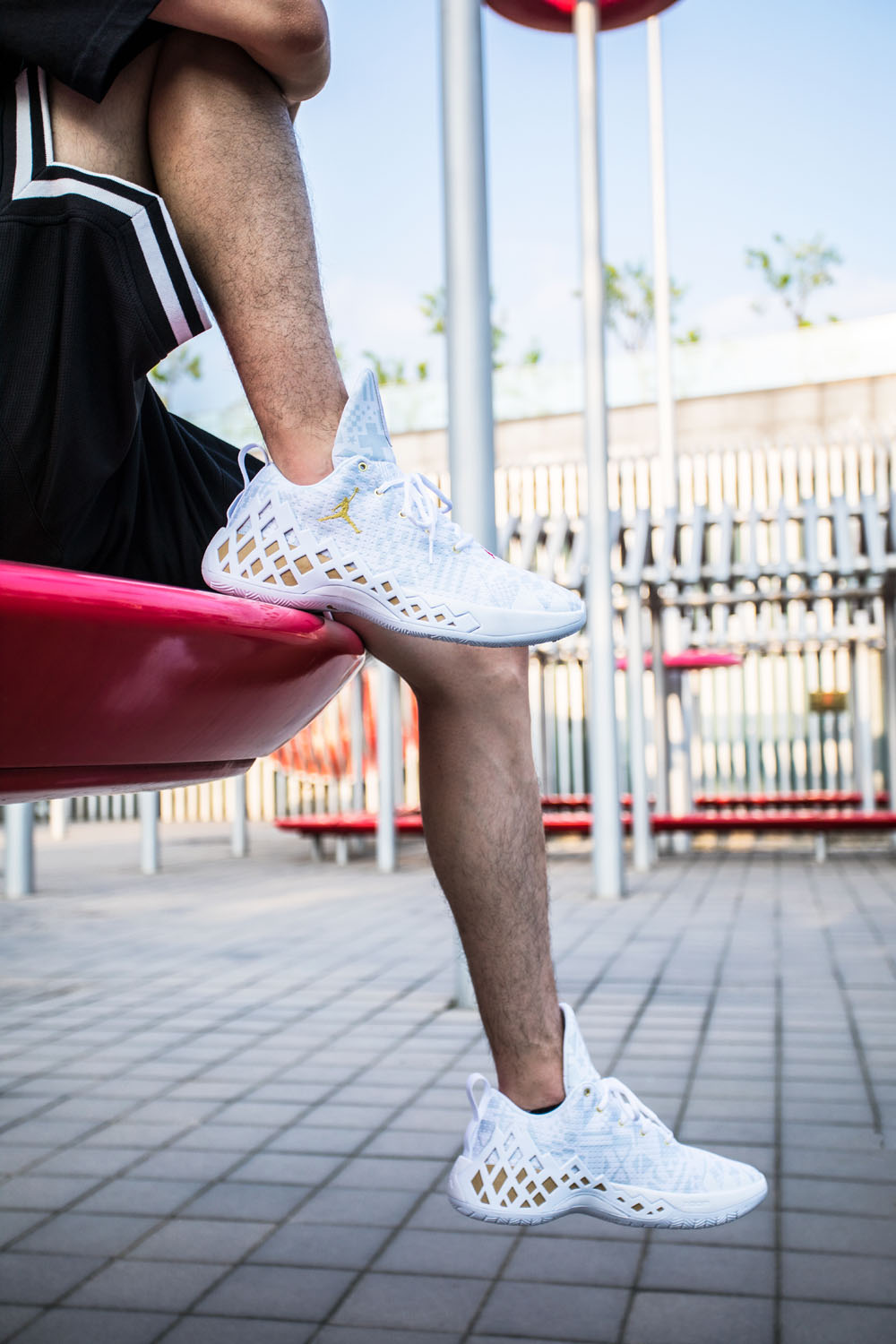 整体以白色为主色调,加入代表中国元素的红色与金色点缀,鞋面上满印的浅灰色暗纹代表了篮球世界杯参赛国家的国旗元素。