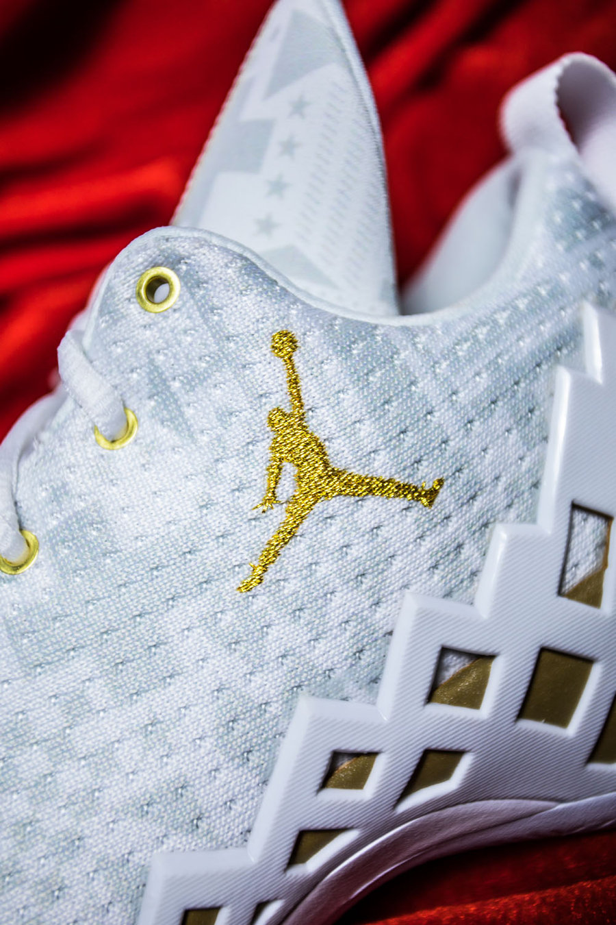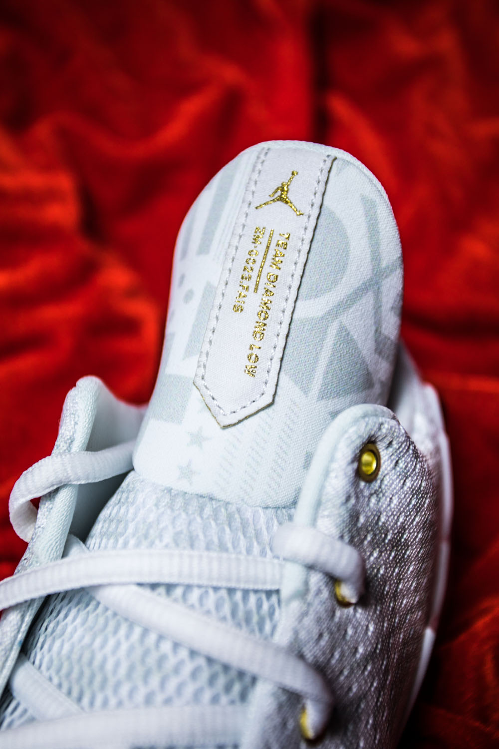这双 Air Jordan 12 以白色为主色调,金色、红色点缀其上,国旗元素暗纹表现在这款鞋的外侧拼接部分。