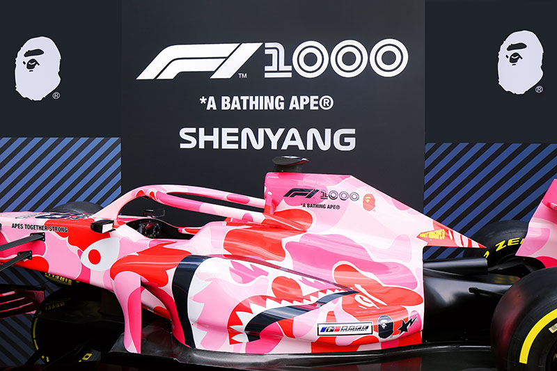 联名赛车通身覆以 BAPE® 经典粉色 ABC 迷彩,以象征 F1® 第 1000 场赛事的 「F1 1000」 字样和 BAPE® 标志性猿人头 LOGO 等细节点缀车身。