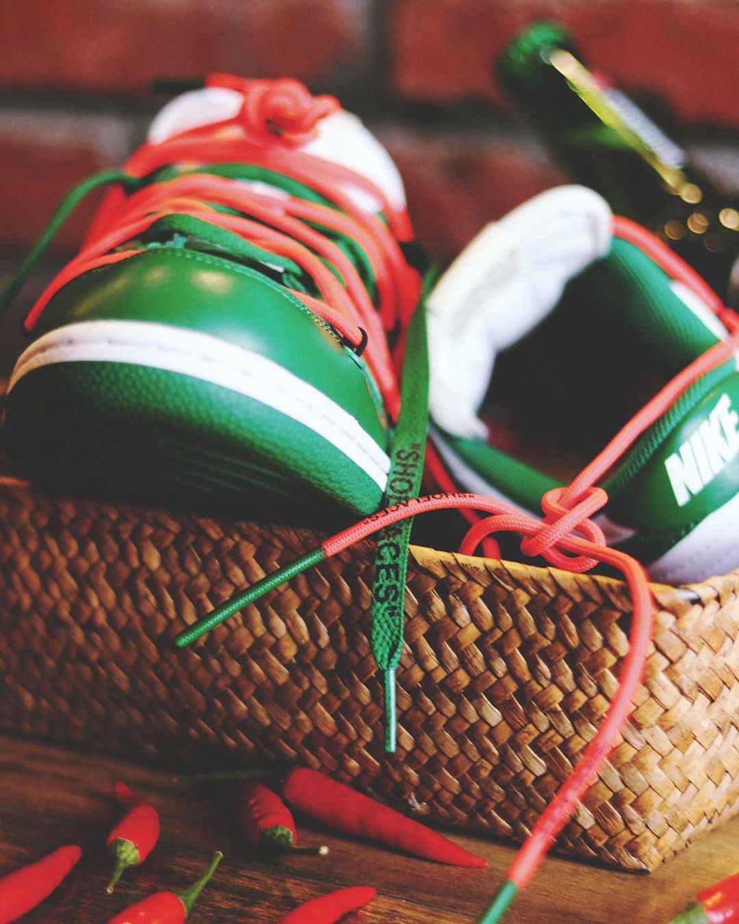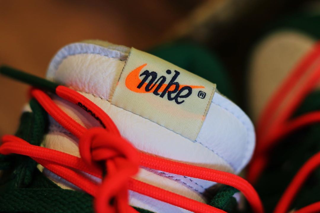 近日网上不仅曝出了更多白绿配色的实物细节美图,还有人首次晒出另一双白红配色 OFF-WHITE x Nike Dunk Low 的实物图。