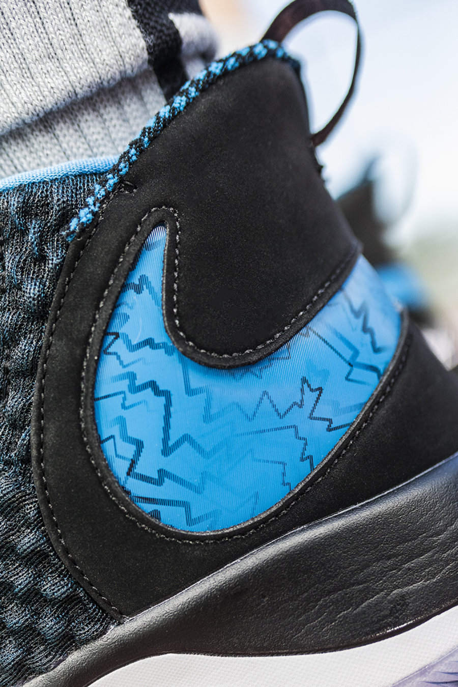 超大 Swoosh 环绕后跟,造型颇为夸张。并且使用类似闪卡的材质,可以看到迷幻的变化图案。