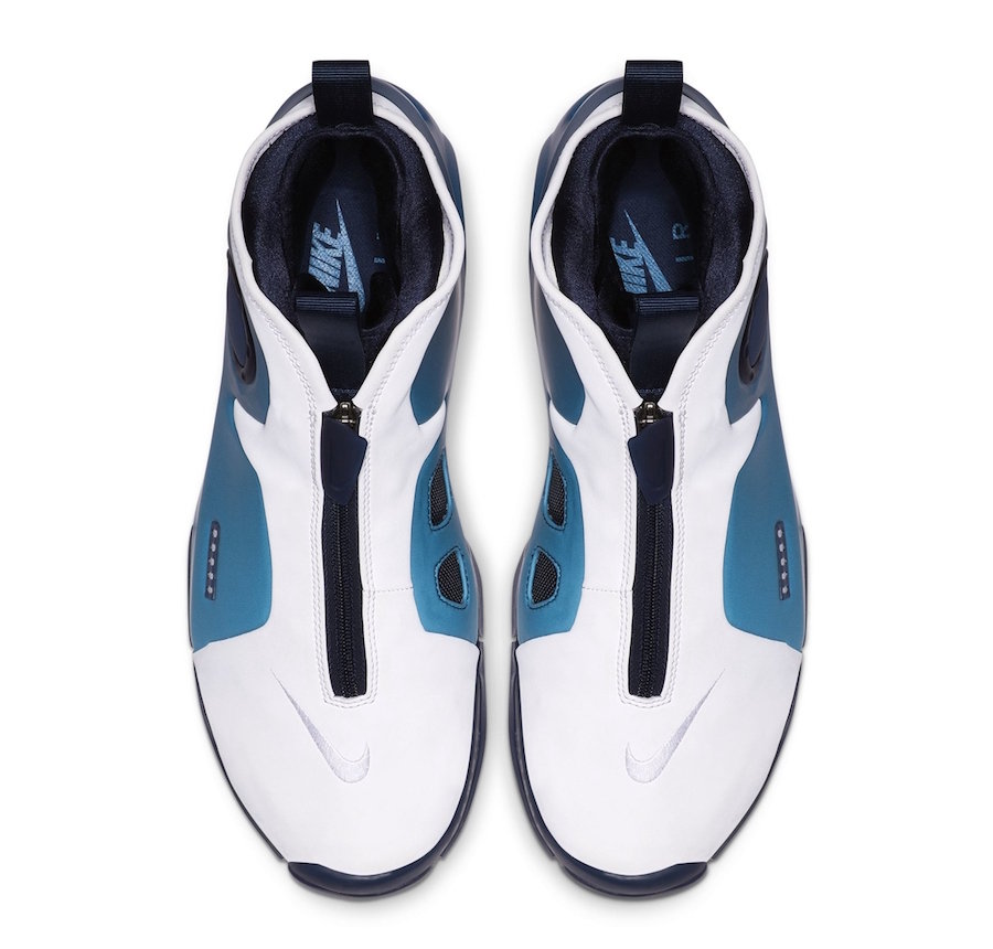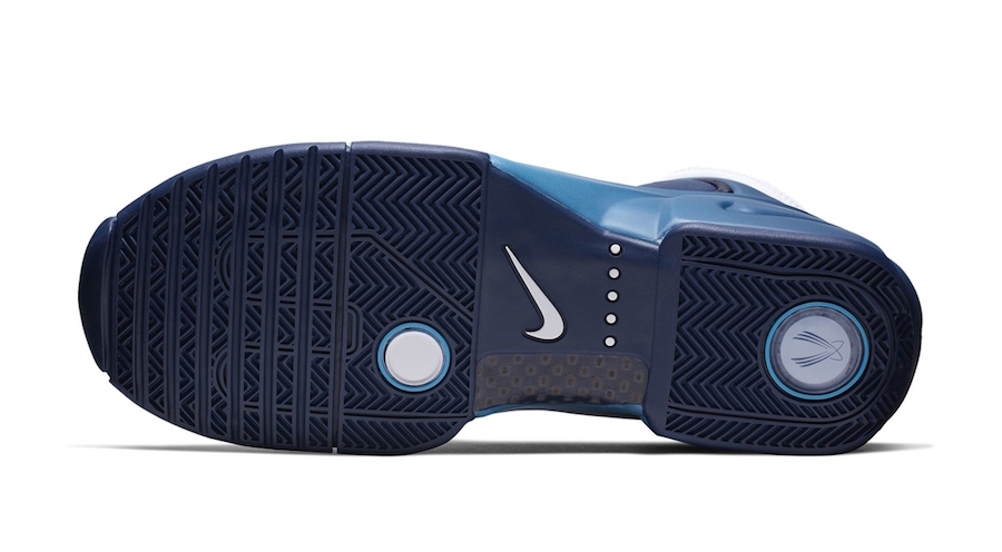 这款奥运配色发泡部分为浅蓝到深蓝的渐变设计,搭配白色的鞋头及领口,令这双看起来厚重凶悍的球鞋多了几分灵动。