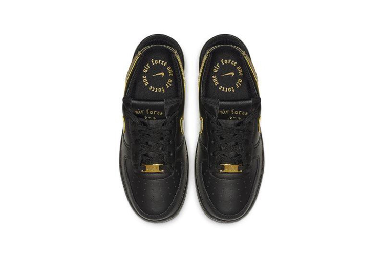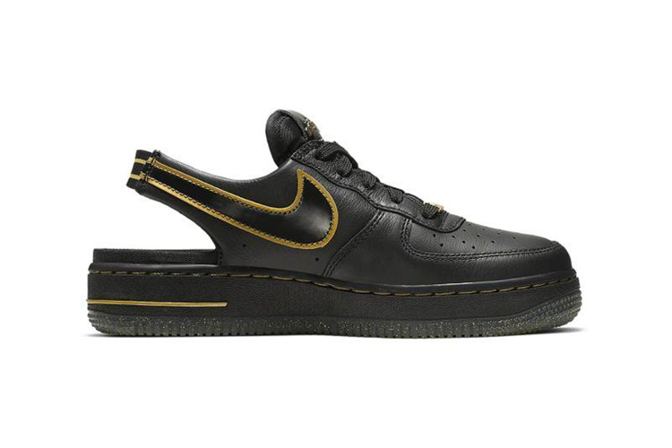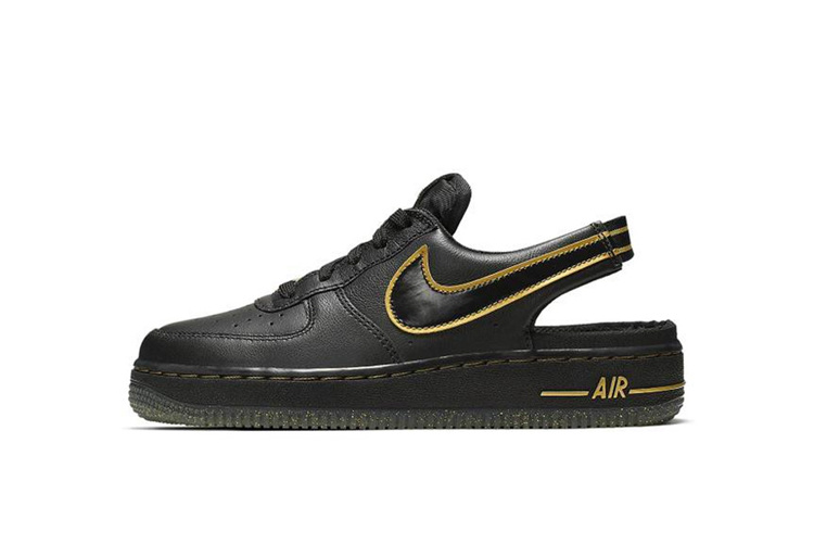 以经典 Air Force 1 为蓝本进行大幅度裁剪,最终以拖鞋造型示人。奢华皮革材质,搭配经典黑金配色,黑色水晶底布满金色散粉装饰,整双鞋显得十分精致。