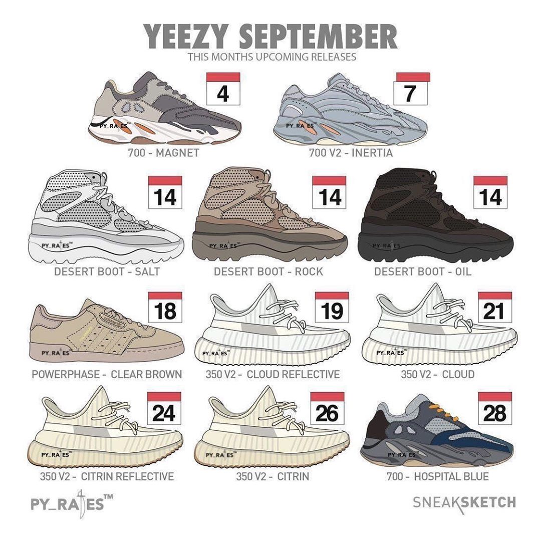 图中一次曝光了 11 双即将在 9 月发售的 Yeezy 新品,并标注了对应的发售日期。