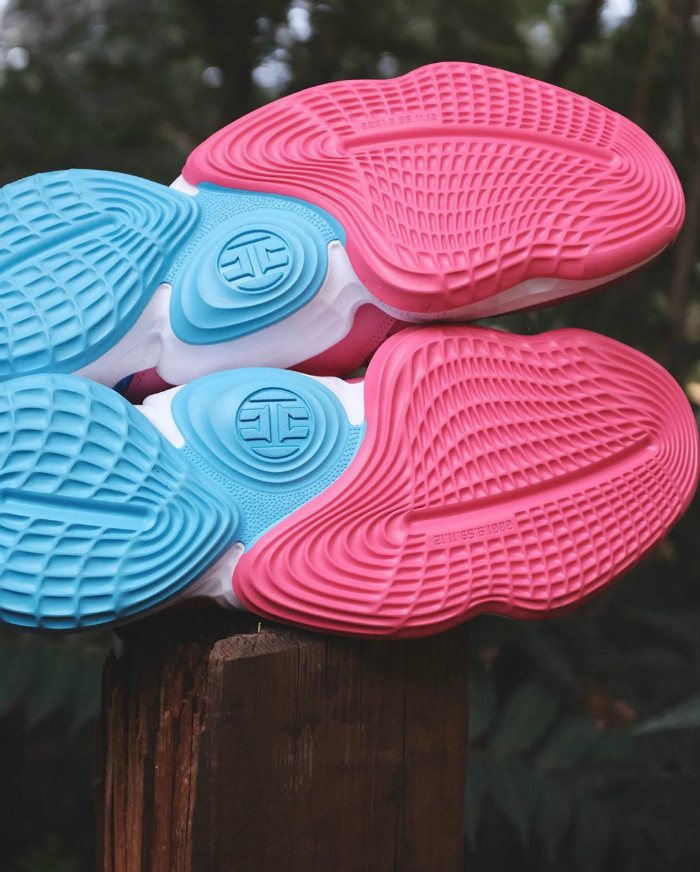 外观方面,整体轮廓同新天足 BYW 系列如出一辙,粉红色鞋面向后过渡为水蓝色,搭配白色中底与同样渐变色调的外底,协调统一之余又格外风骚!