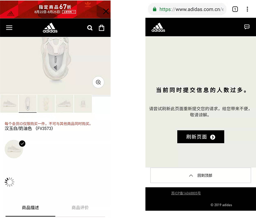 今早的发售在 9:30 左右已经让人感受到了火爆的氛围,距离发售还有半小时,adidas 官网就已经卡顿严重,以致无法打开。