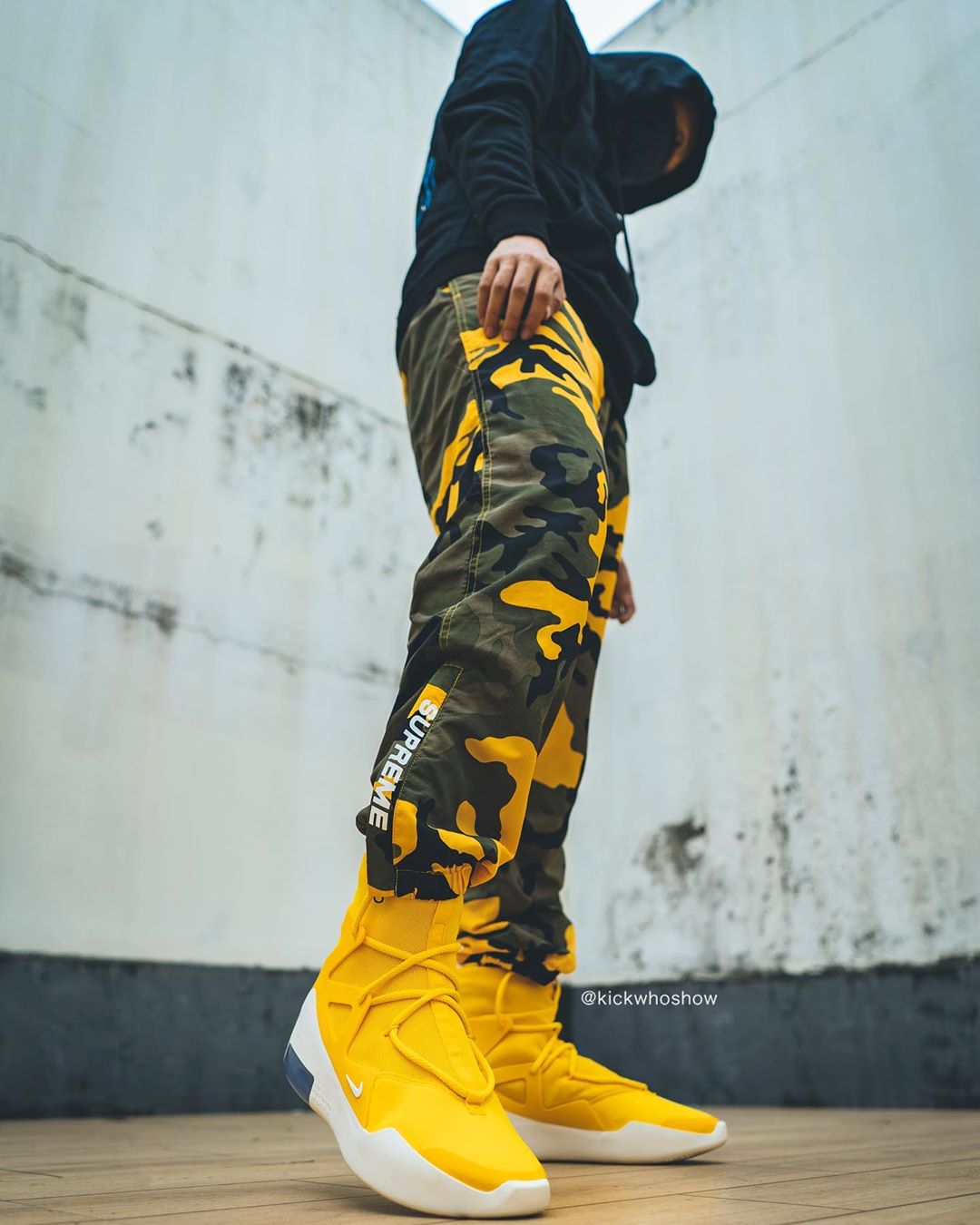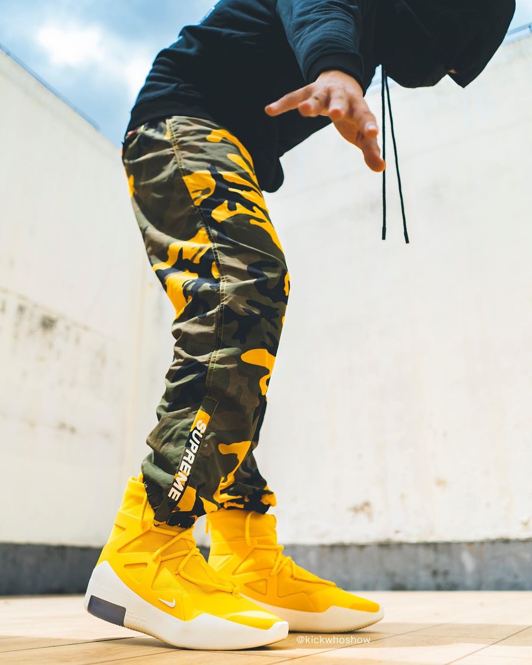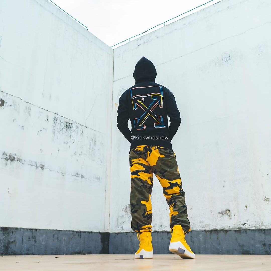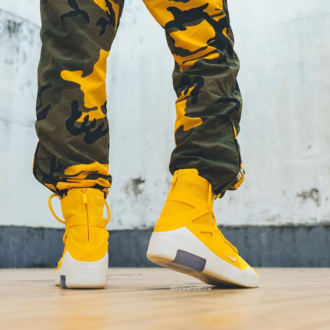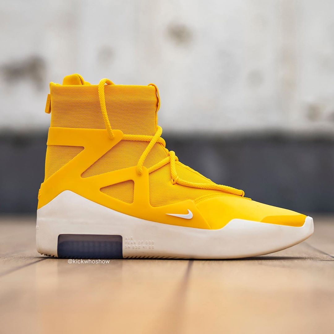 近日 Instagram 球鞋账号 @kickwhoshow 率先带来黄色 Air Fear of God 1 “Amarillo” 的上脚照。