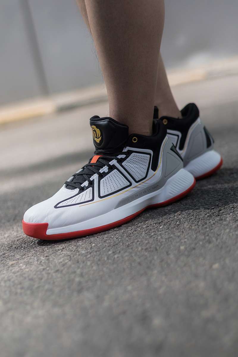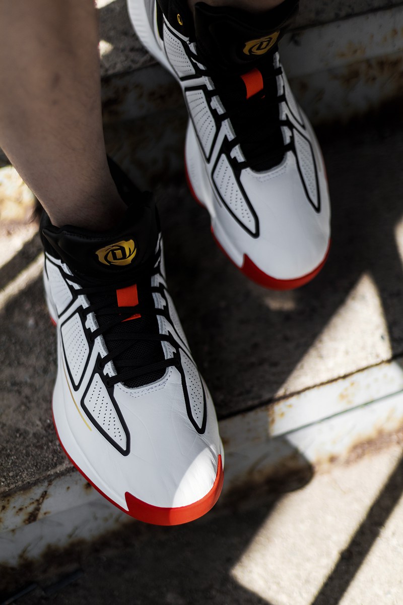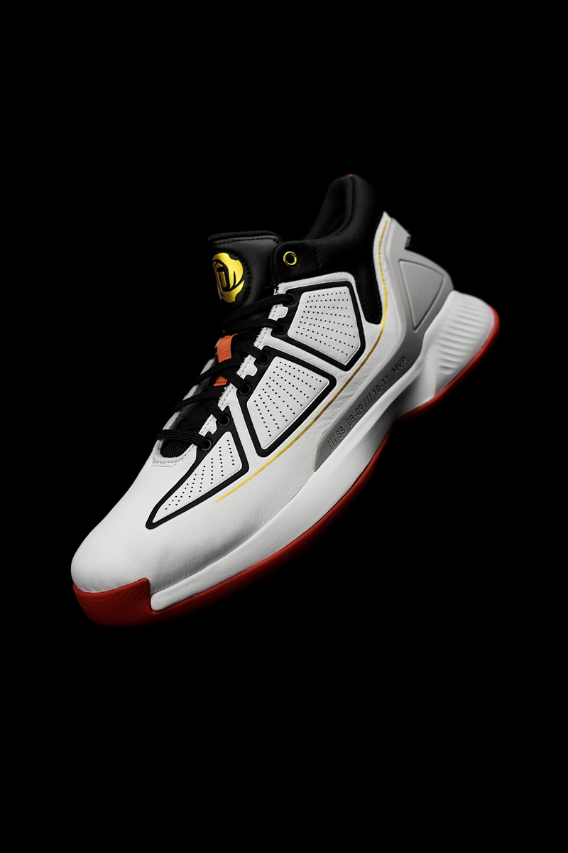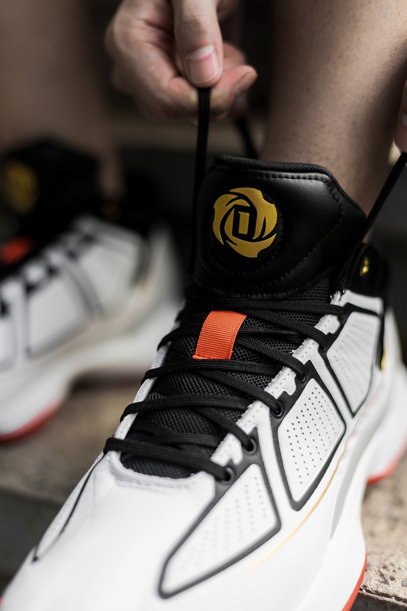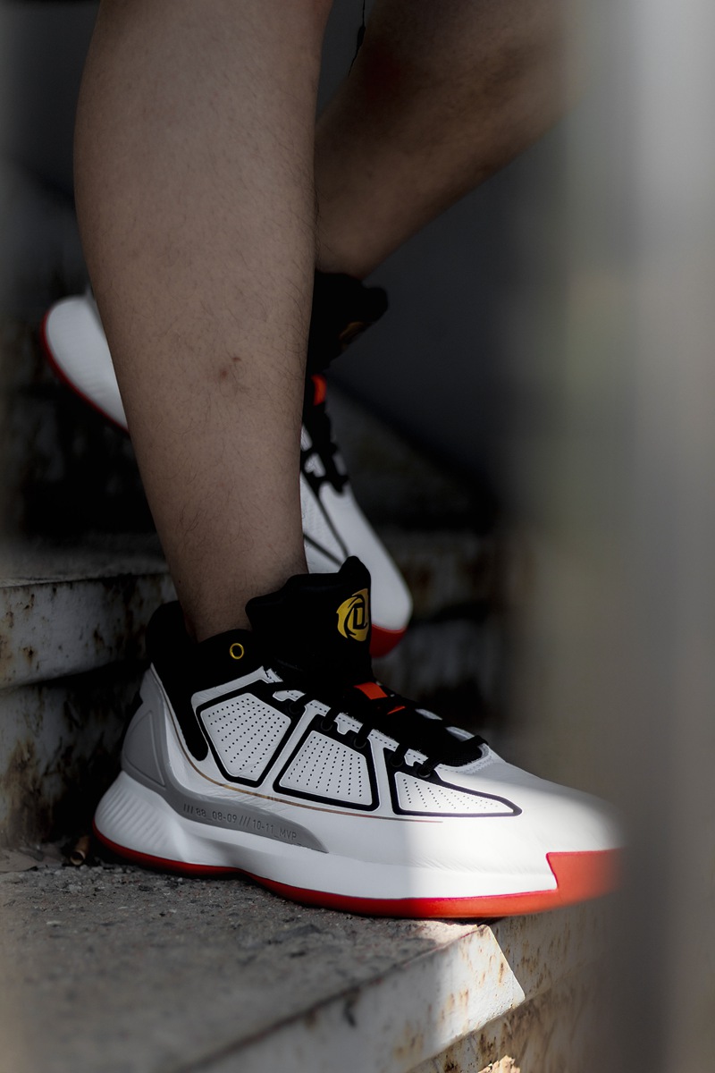 鞋面采用分段式冲孔设计,白色鞋面上的黑色压纹形成抽象化的 adidas 三线,营造出罗斯比赛中的力量感与速度感,更毫无违和。