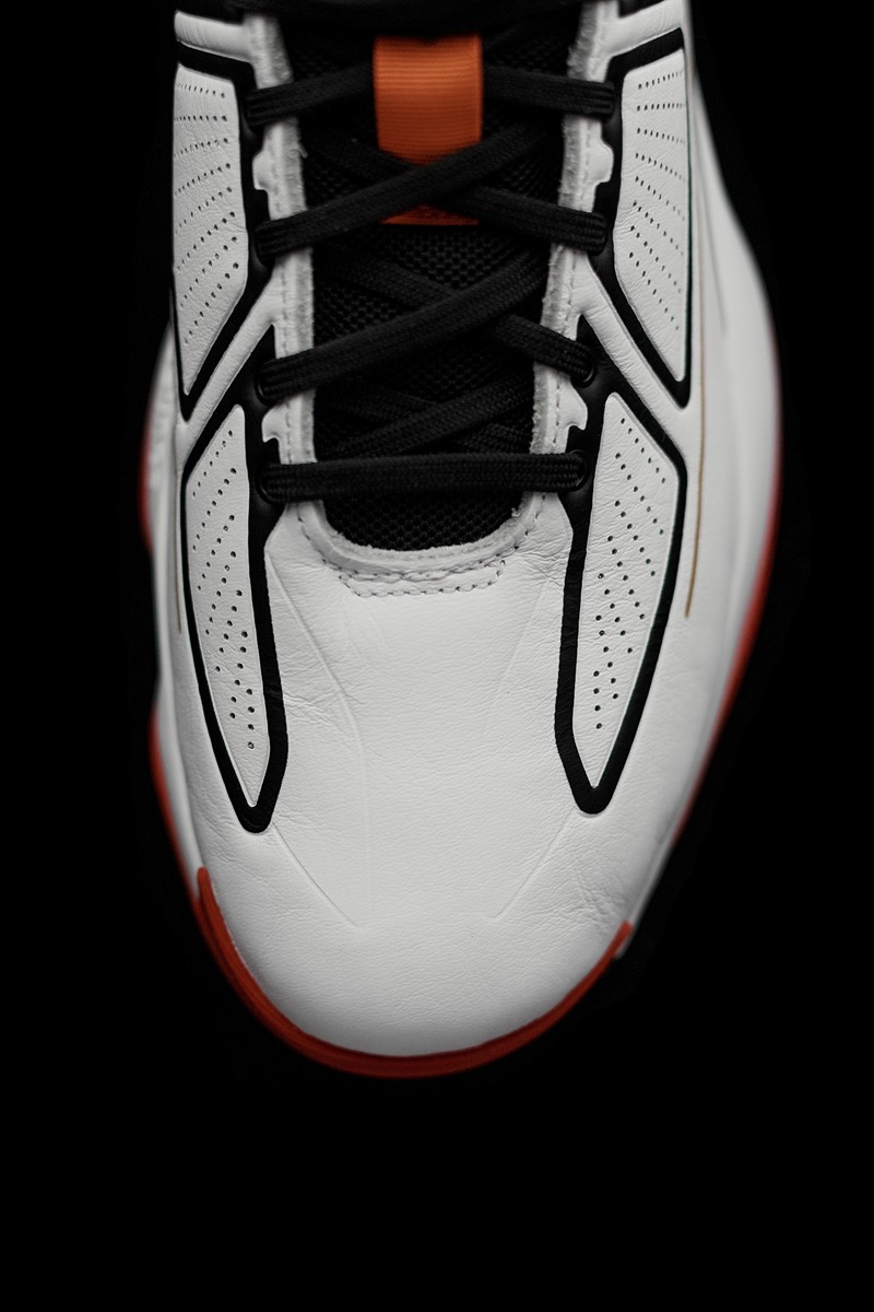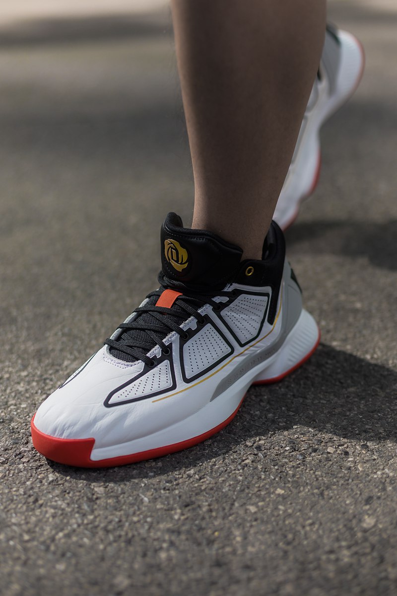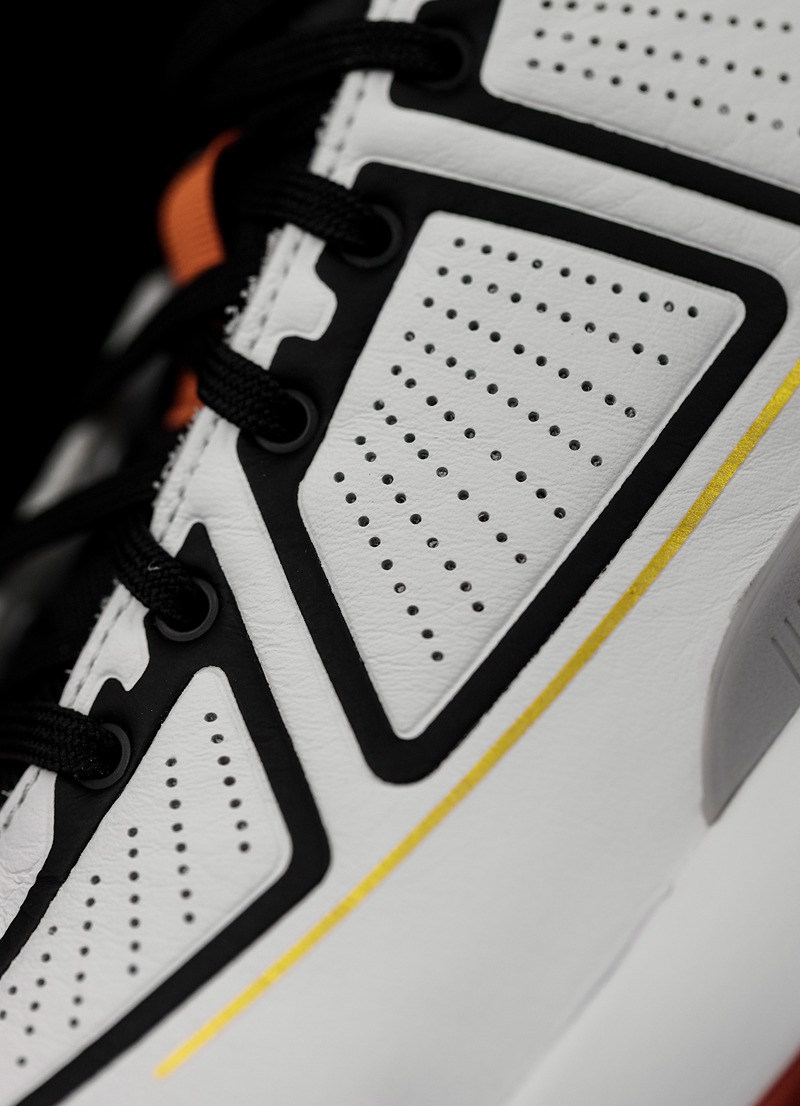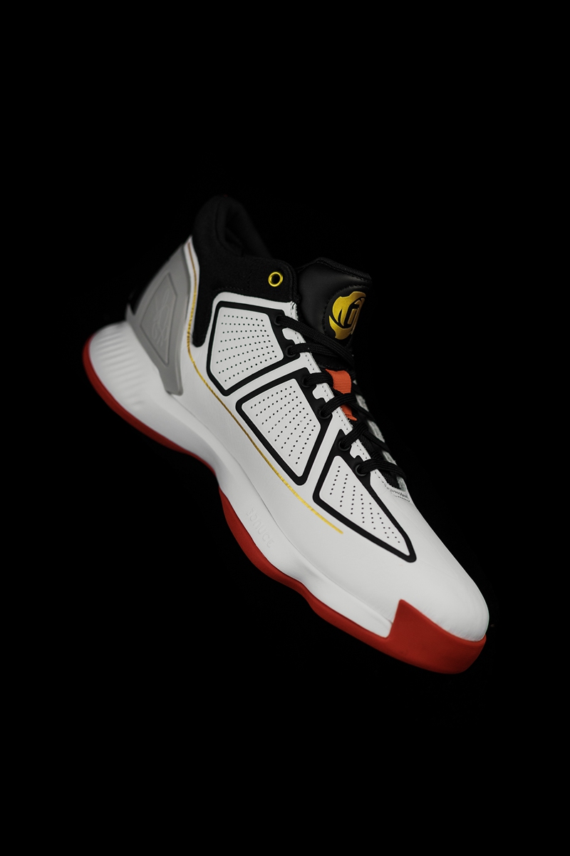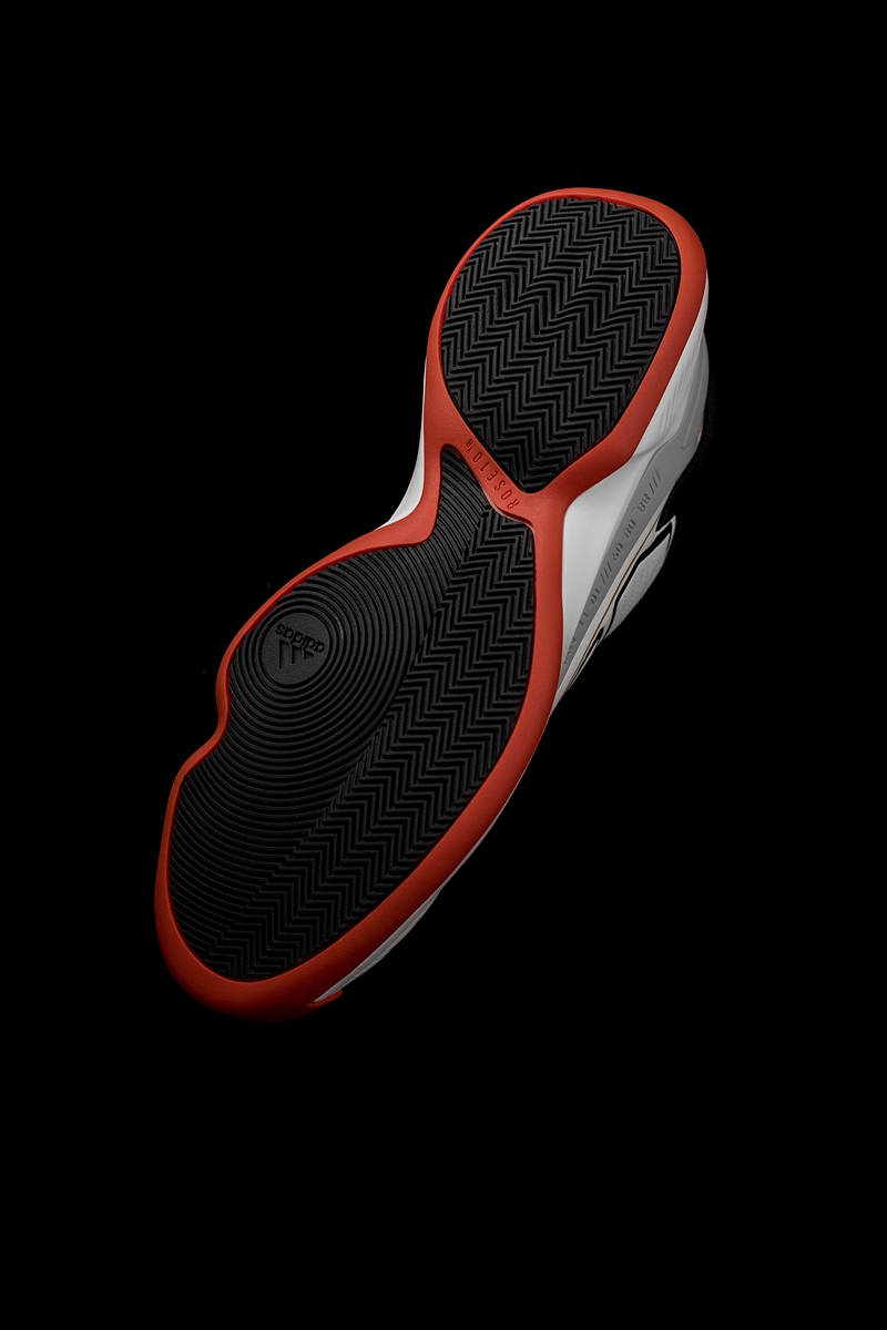 鞋面采用分段式冲孔设计,白色鞋面上的黑色压纹形成抽象化的 adidas 三线,营造出罗斯比赛中的力量感与速度感,更毫无违和。