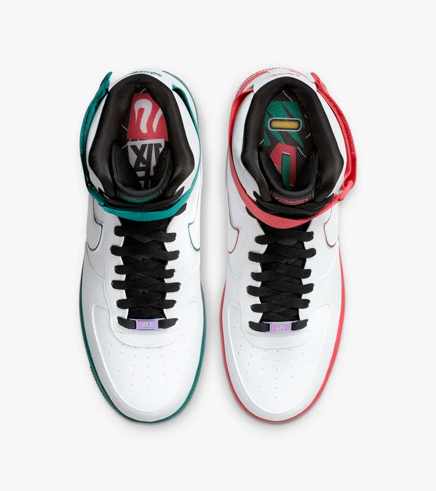 最大的特点就是选用了鸳鸯设计,双脚均以白色为主色,鞋底、绑带、Swoosh 等多处分别以红、绿两色装扮,带来极具冲击力的效果。
