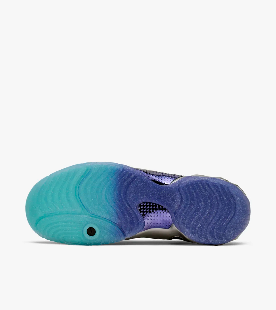 本次从光碟背面的映射效果汲取灵感,液态银覆盖鞋身搭配电镀紫稳定片,外加掺入闪粉的渐变果冻外底收尾,十分亮眼。