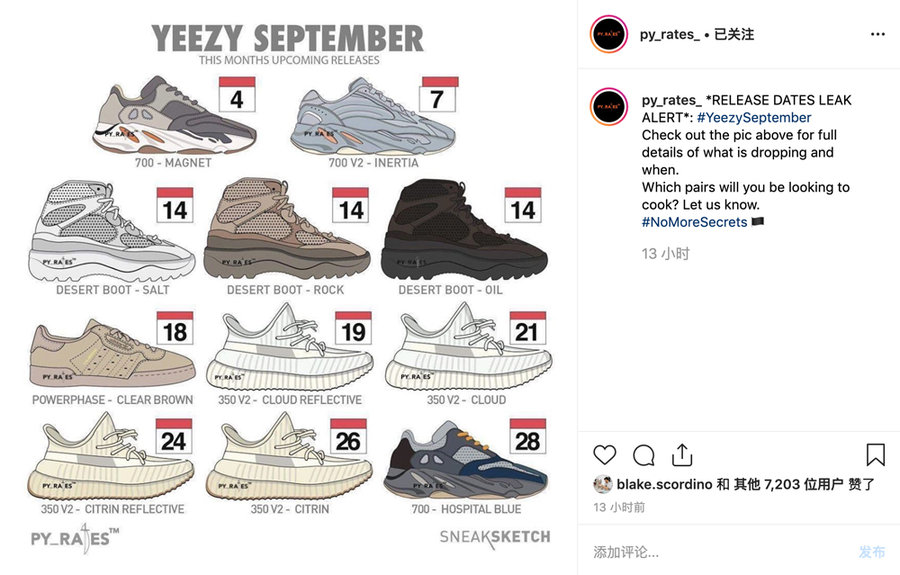 前几天,知名球鞋爆料账号 @py_rates_ 为我们曝光一则重磅消息,就在下个月,Yeezy 系列即将发售 11 款新品。