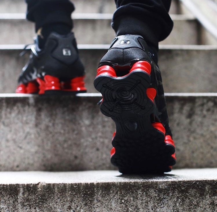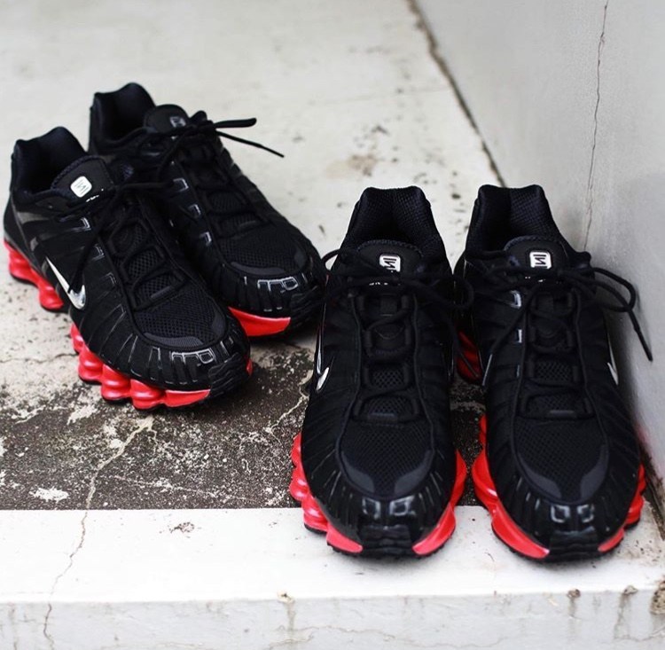 这款全新联名以 Nike Shox TL 为蓝本设计,以标志性的黑红搭配呈现。