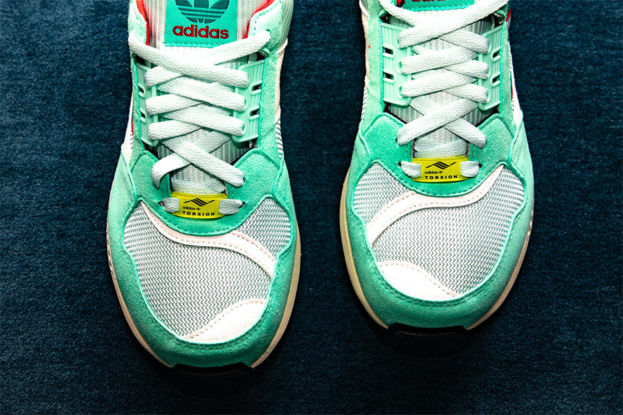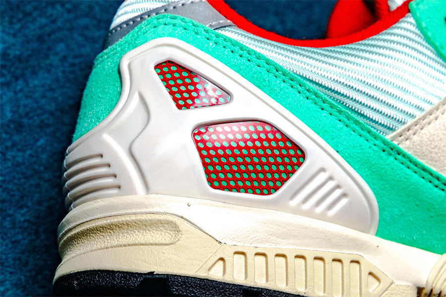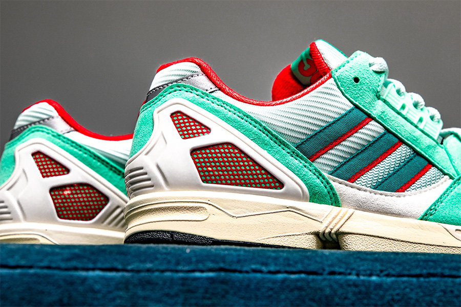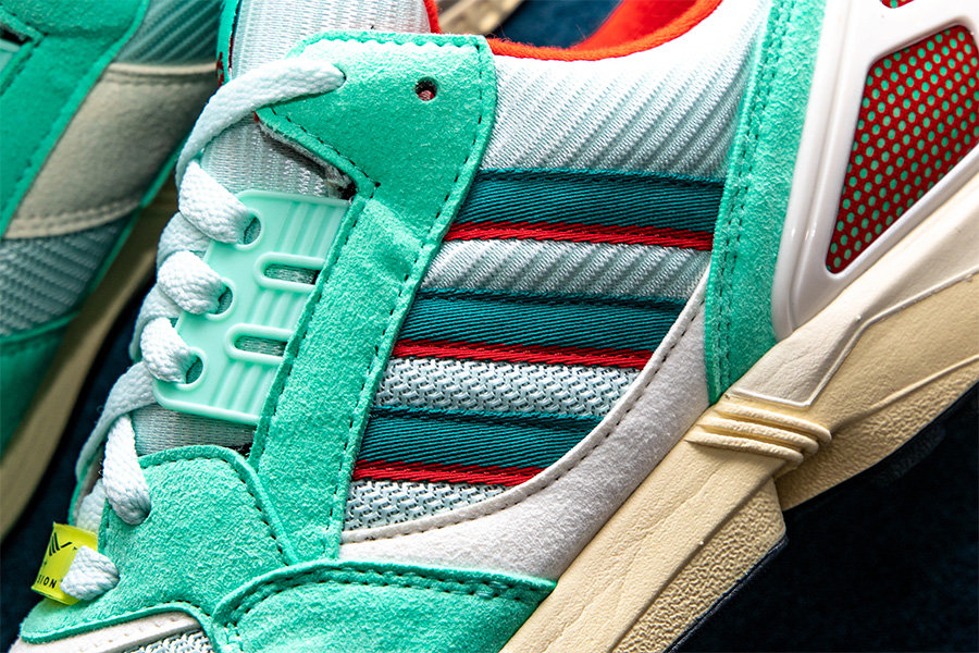 在三十周年之际,眼前的 adidas Originals ZX 9000 以 1989 年 OG 款的绿色配色为主题,带来一个薄荷绿的清爽装扮,细节以鲜红点缀,营造了清新又活力无限的视觉感受。