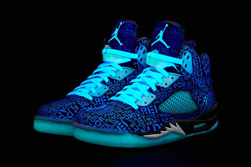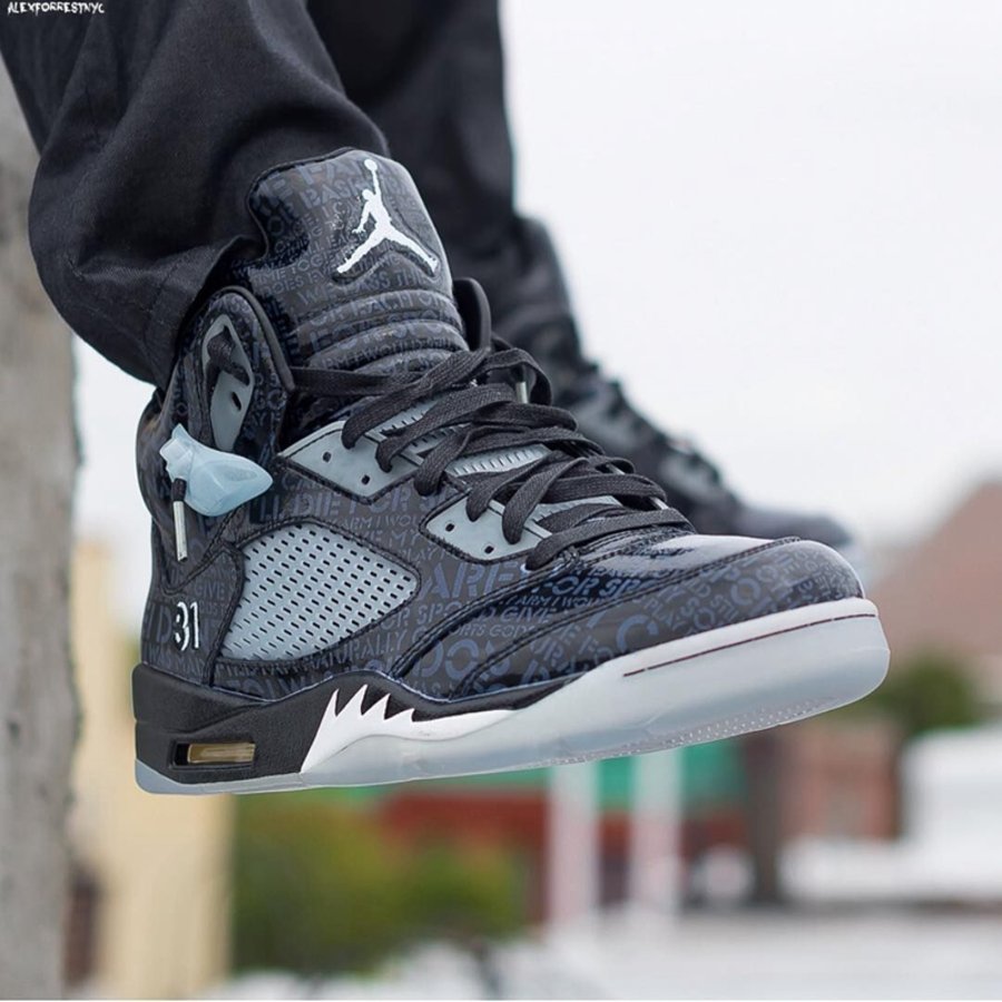 慈善 Air Jordan 5 也是系列中极具人气的一款,黑色漆皮暗藏全息反光效果,这在正代 Air Jordan 中是极为少见的。纪念英年早逝的天才少年,鞋面印有他的诗句,意义非凡。