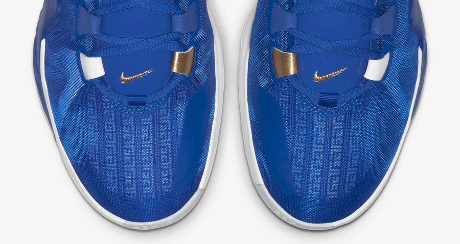 这双鞋以蓝白两色为主色调,鞋身 Swoosh Logo 以金色装饰,鞋带扣、mini Swoosh Logo、个人专属 Logo 均以金色刺绣呈现。