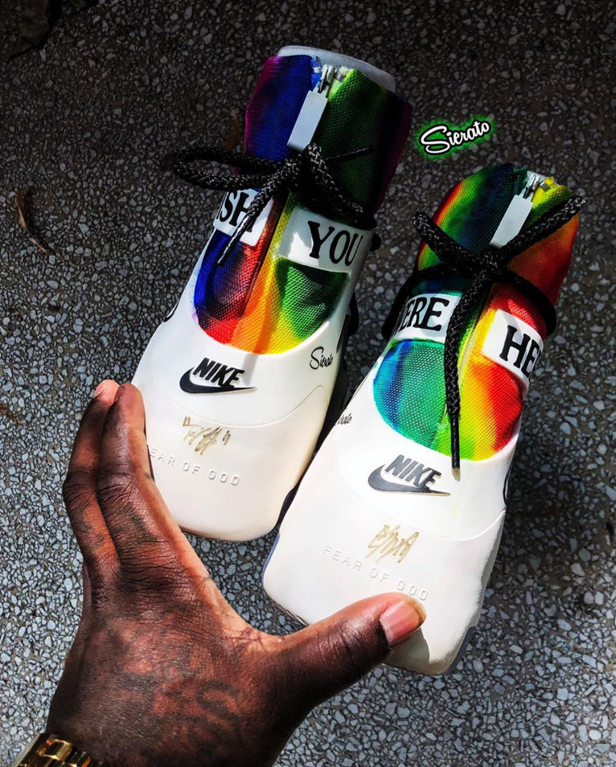 以 Nike Air Fear of God 1 为蓝本,扎染鞋面呈现出绚烂彩虹效果,搭配黑色鞋带与麂皮鞋头,整双鞋活力十足同时不失稳重。