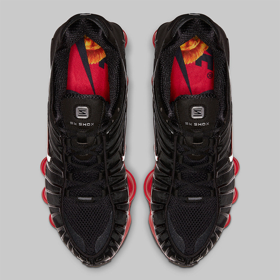 这款全新联名以 Nike Shox TL 为蓝本设计,以标志性的黑红搭配呈现。