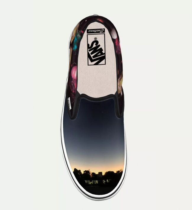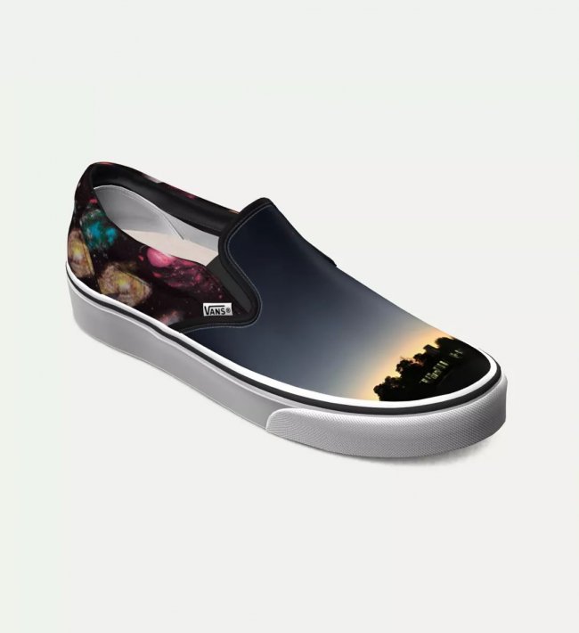 以这张照片为灵感设计出一双星空主题的 Slip-on,照片在整个鞋面呈现而出,鞋腰与后跟加入太空定制元素,为了避免太花太乱其他细节都以黑白填充。